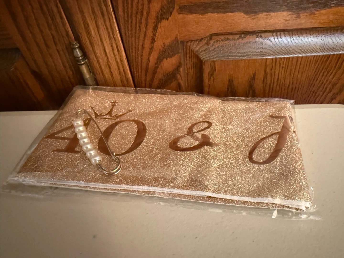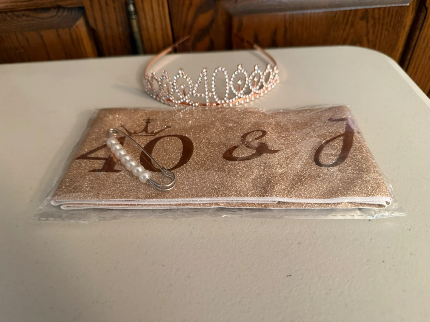 Celebrate your 40th birthday with this sparkly rose gold sash and rhinestone tiara set. The sash reads '40 & Fabulous' and comes with a pearl-adorned safety pin. The tiara features clear rhinestones and comb teeth for secure wear. Perfect for making birthday memories!
