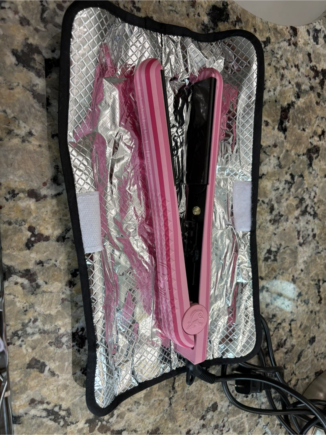 This pink hair straightener comes with a matching comb and a silver heat-resistant mat. It's a handy set for styling your hair and protecting surfaces. It includes everything you need for a quick touch-up or a full style!