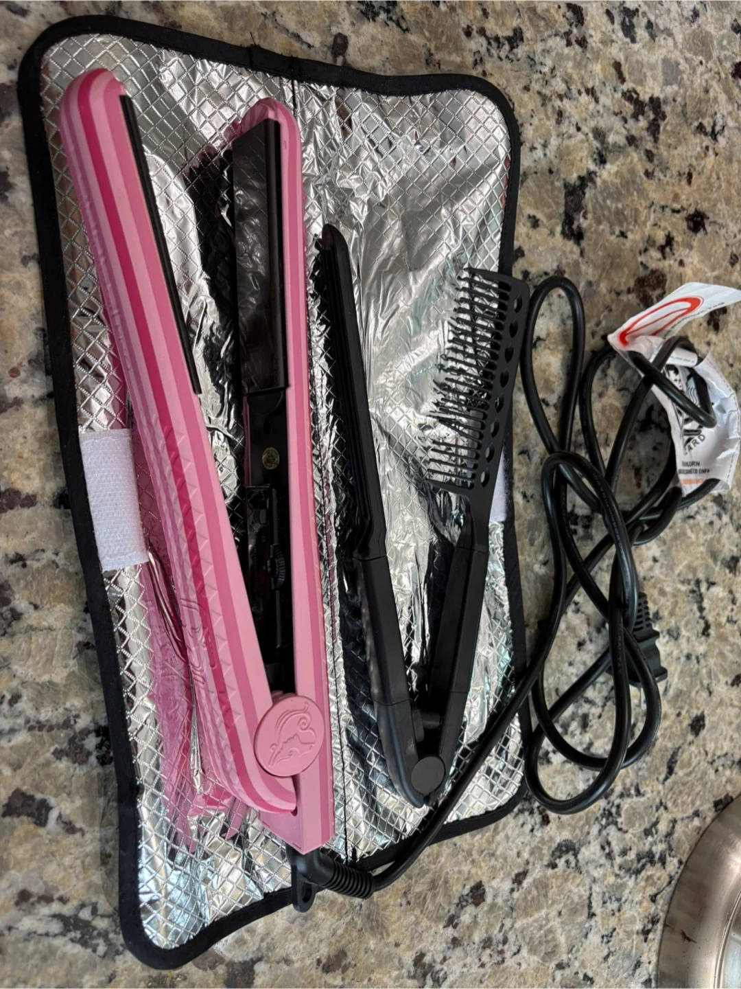 This pink hair straightener comes with a matching comb and a silver heat-resistant mat. It's a handy set for styling your hair and protecting surfaces. It includes everything you need for a quick touch-up or a full style!