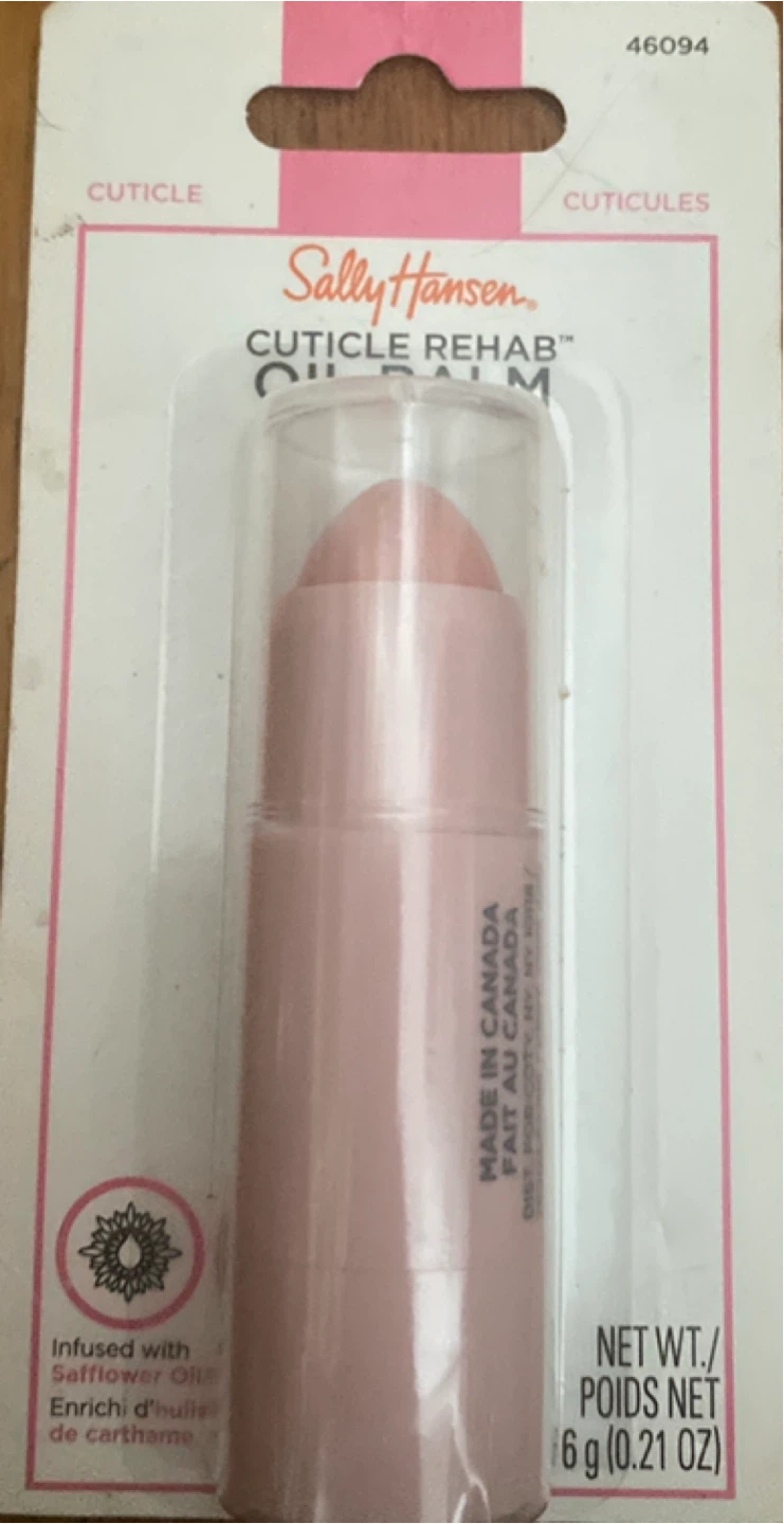 Sally Hansen Cuticle Rehab Oil Balm. Infused with Safflower Oil. 6g (0.21 oz) net weight. Made in Canada.