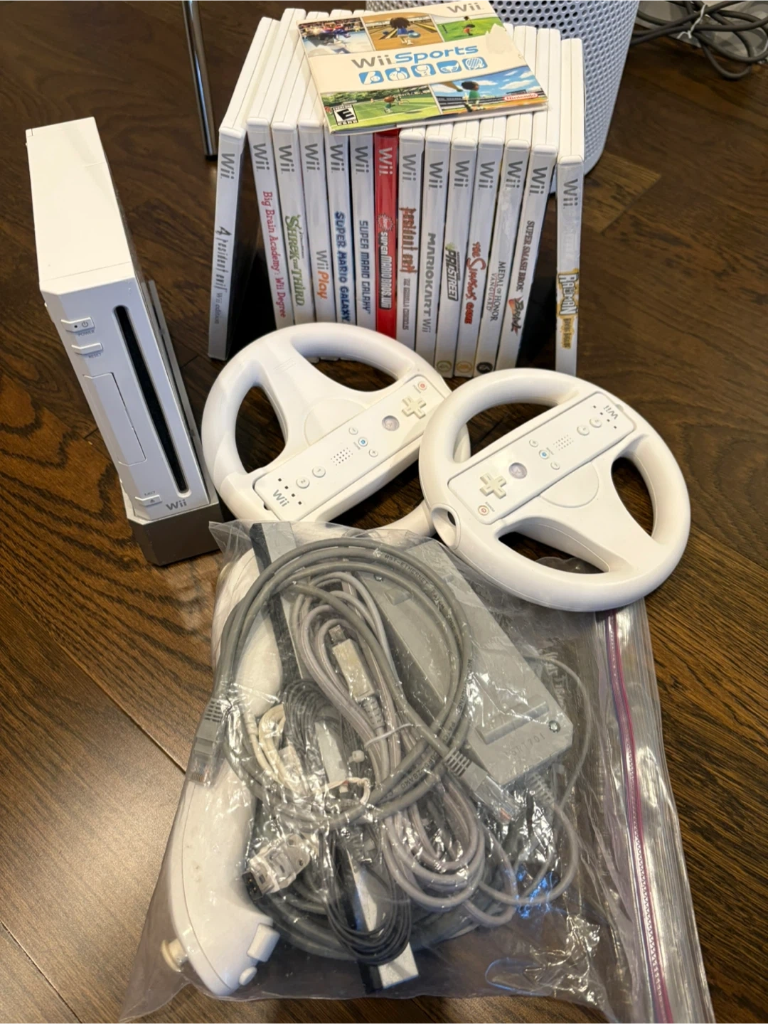 Nintendo Wii console bundle including Wii Sports and other games like Mario Kart.