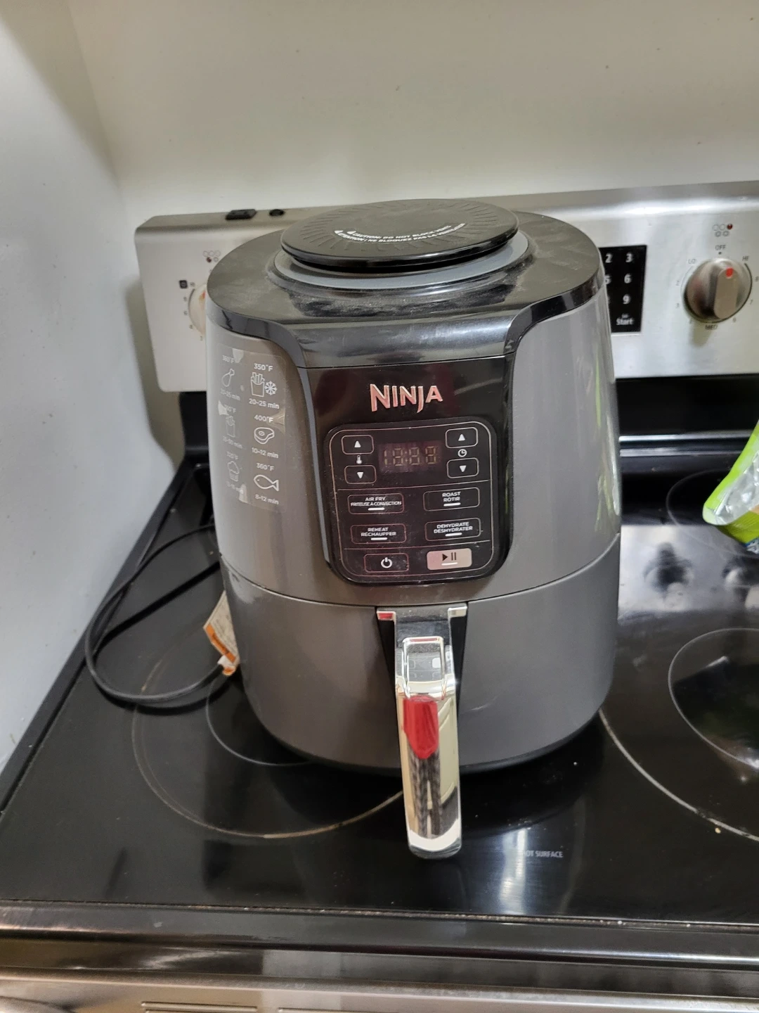 This is a Ninja air fryer. It has various cooking functions and temperature settings visible on the panel, including air fry and dehydrate options. Perfect for quickly preparing meals or snacks!