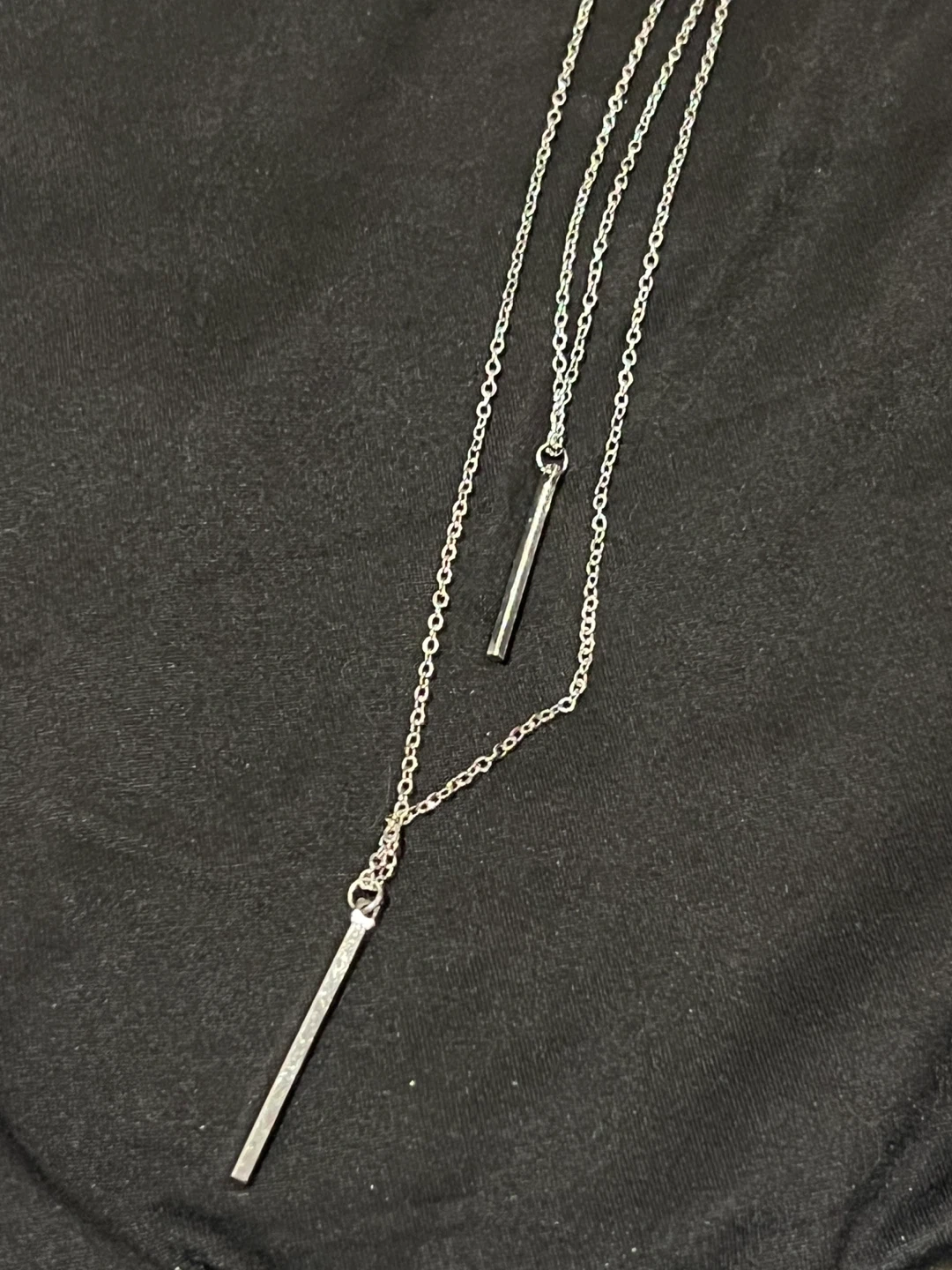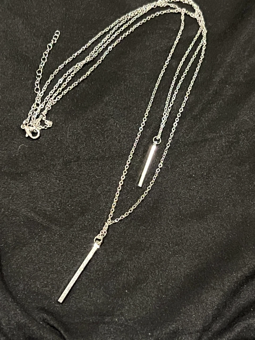A delicate layered necklace featuring two silver bar pendants. It's made with a silver-toned metal. This necklace adds a subtle touch of modern style.