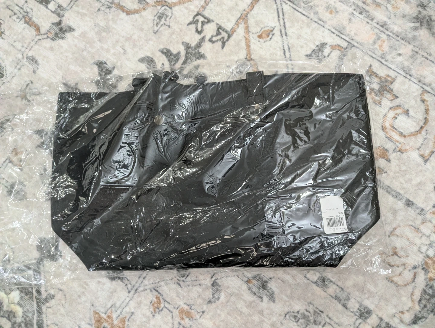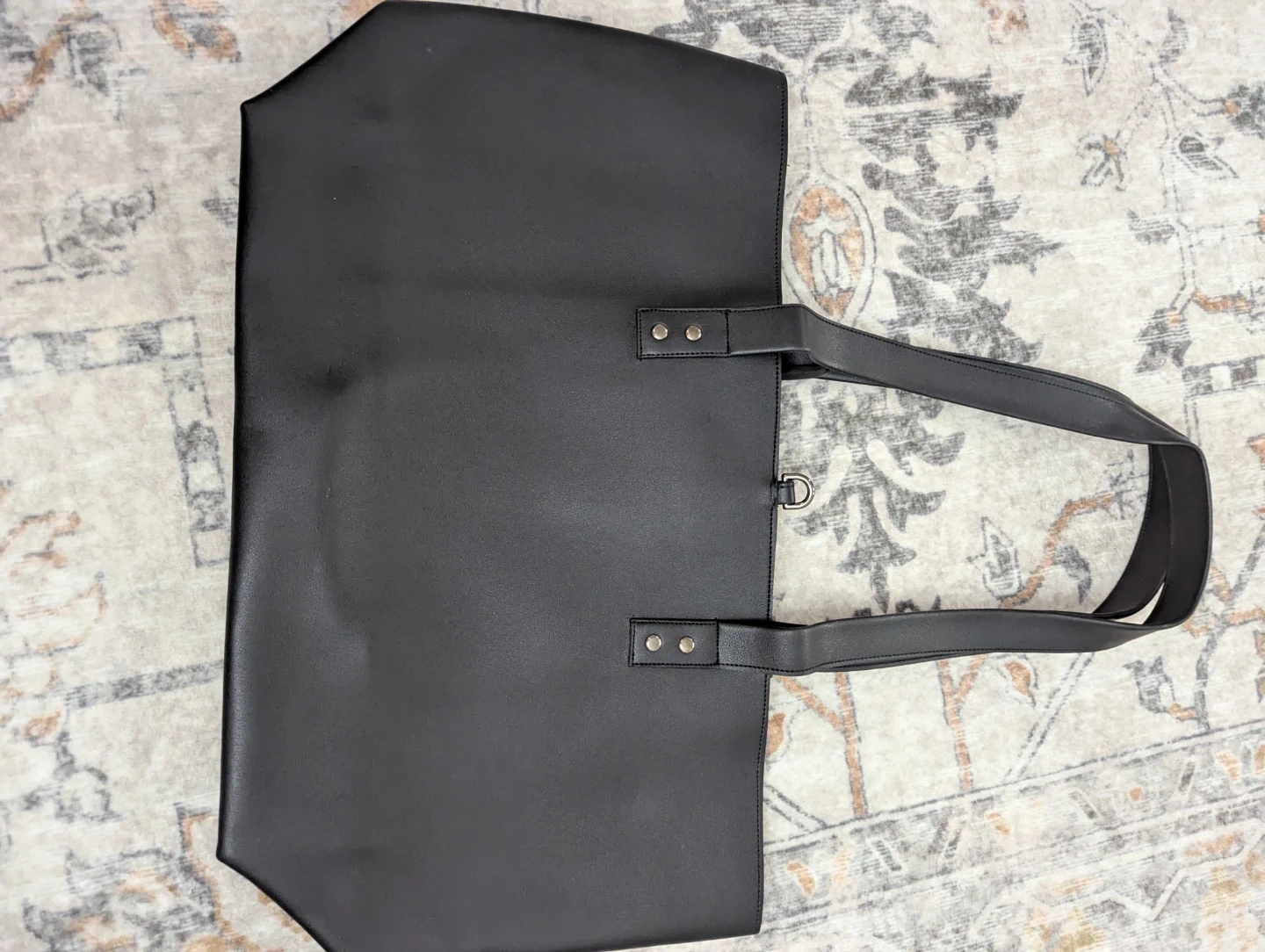 NEVER USED! This black Guess tote bag comes with a matching coin pouch. It's a stylish and practical accessory for everyday use. The tote features a spacious interior with a small pocket. Made from faux leather.
