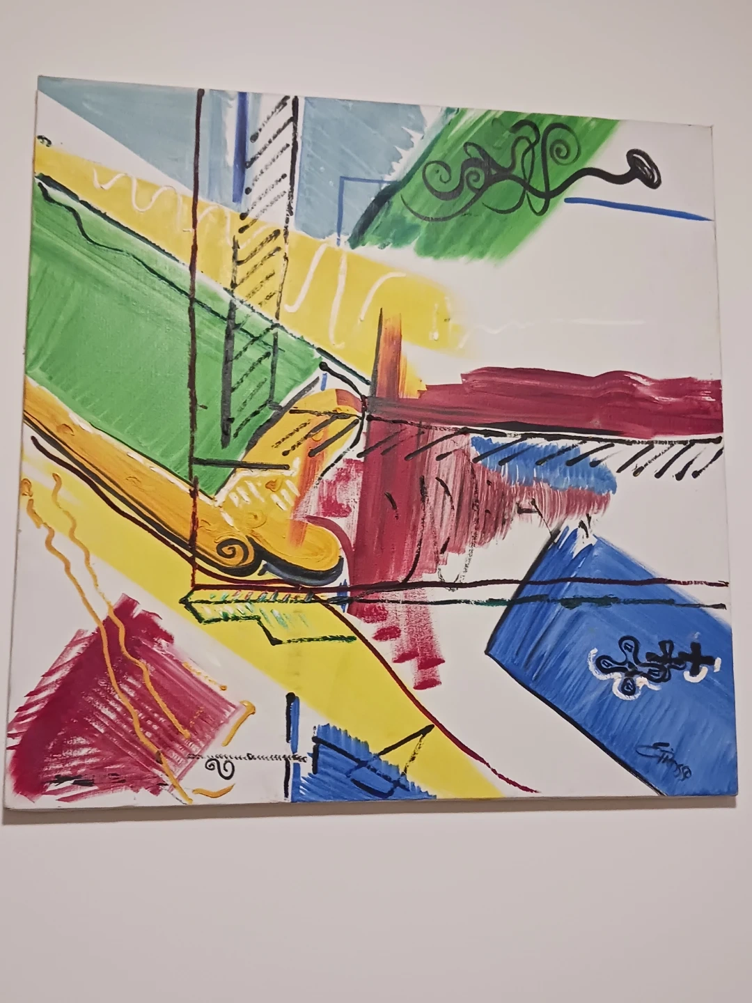 This is a vibrant abstract painting featuring bold strokes of red, yellow, green, and blue. The artwork has a modern feel with intersecting lines and geometric shapes. It's unsigned, so the artist is unknown. Adds a pop of colour to any space!