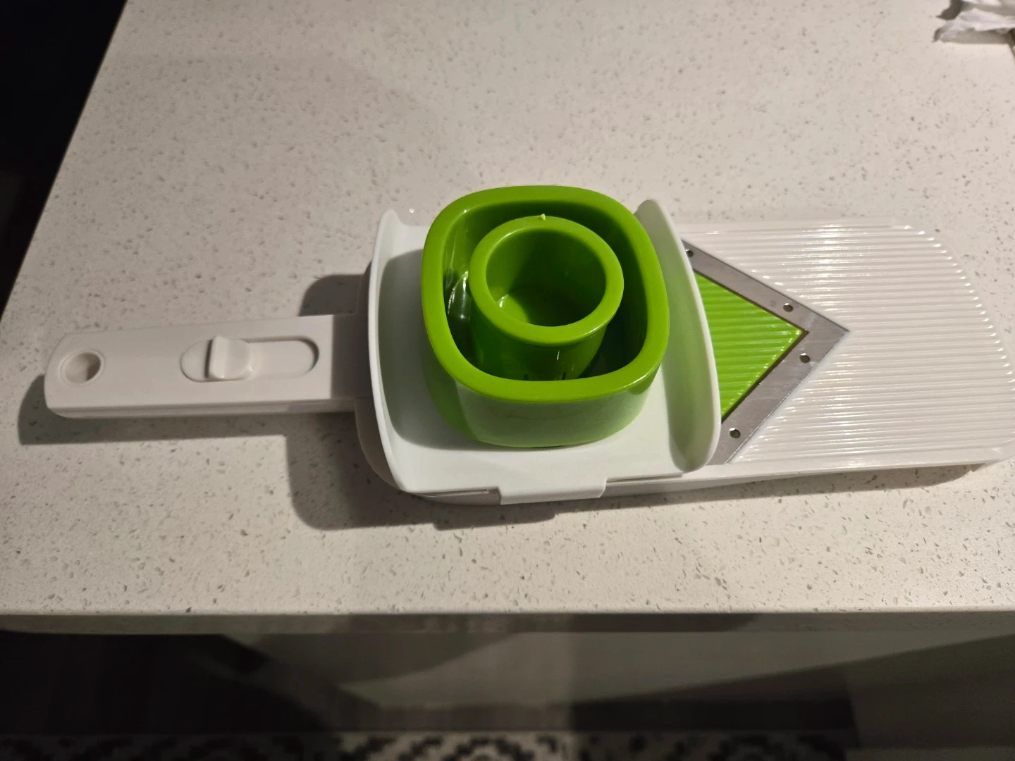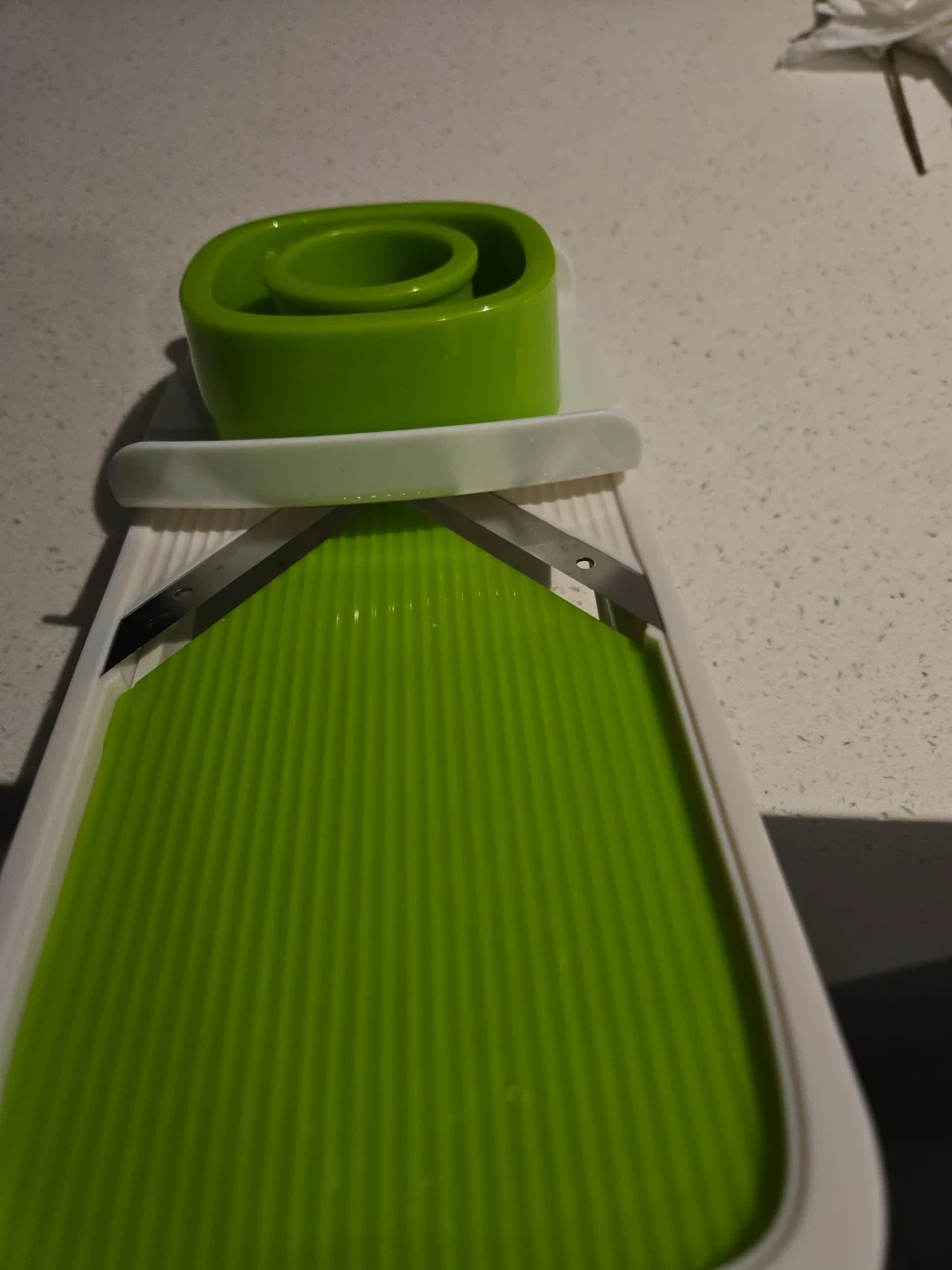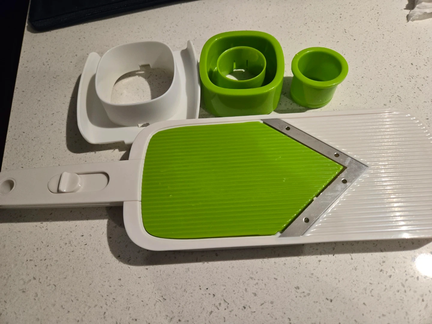 This mandoline slicer comes with a food holder for safe use. It features a sharp stainless steel blade and plastic construction. Additional green inserts are included for different slicing options. The metal slicer is sharp, keep away from children. All pieces come apart.