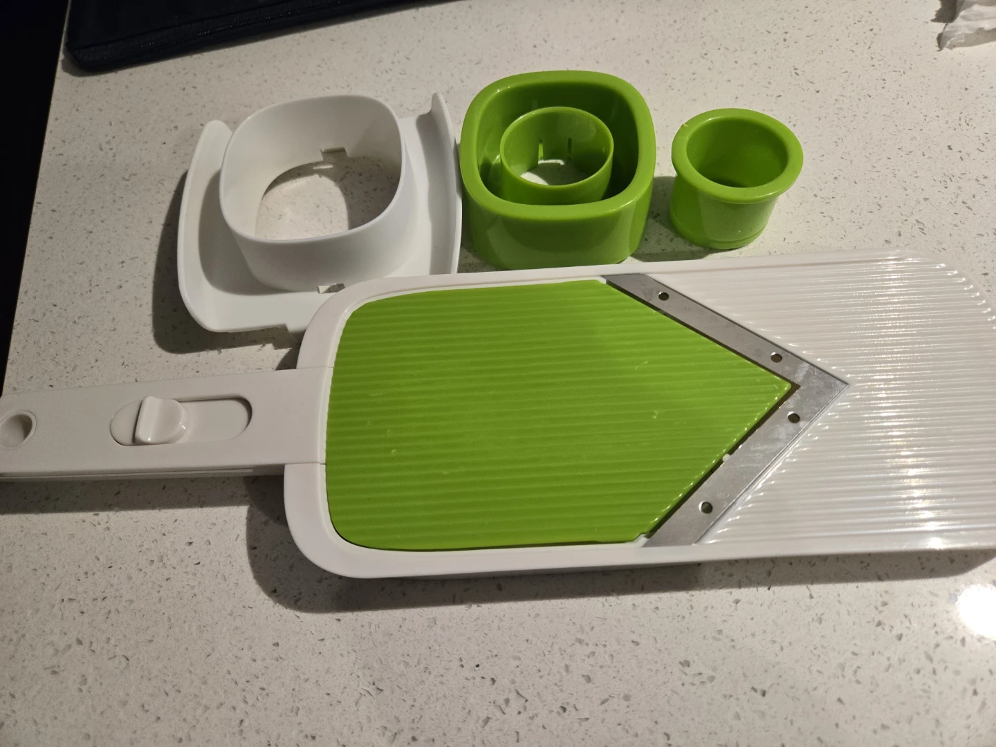 This mandoline slicer comes with a food holder for safe use. It features a sharp stainless steel blade and plastic construction. Additional green inserts are included for different slicing options. The metal slicer is sharp, keep away from children. All pieces come apart.