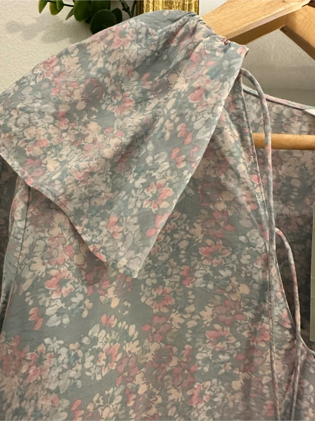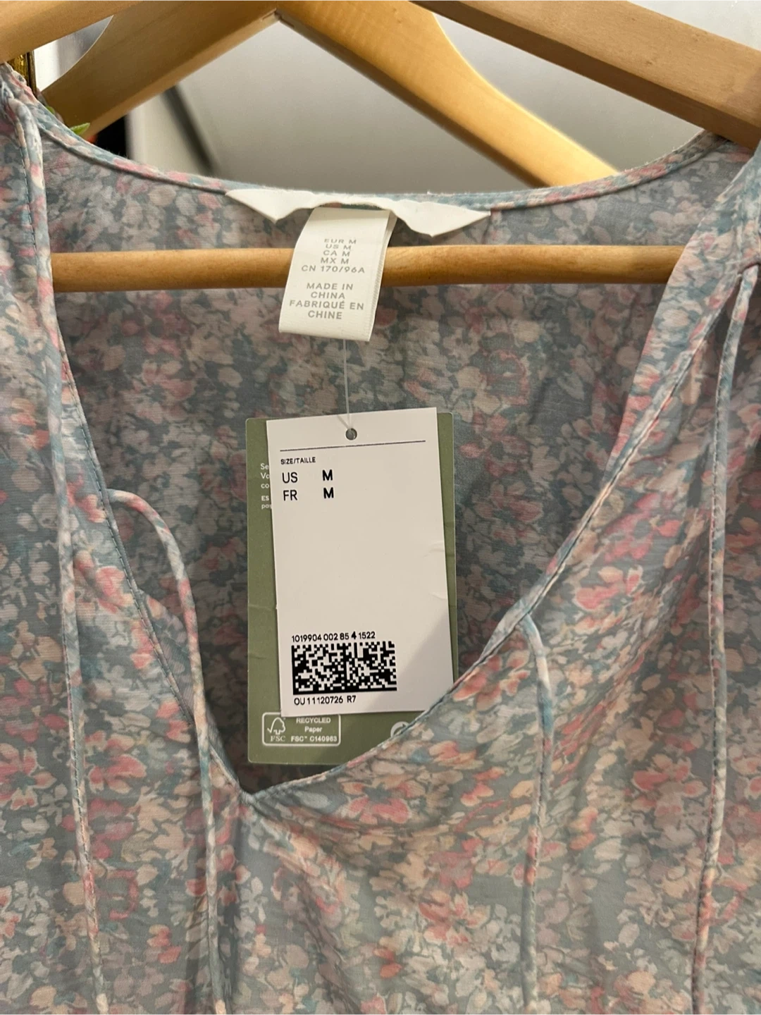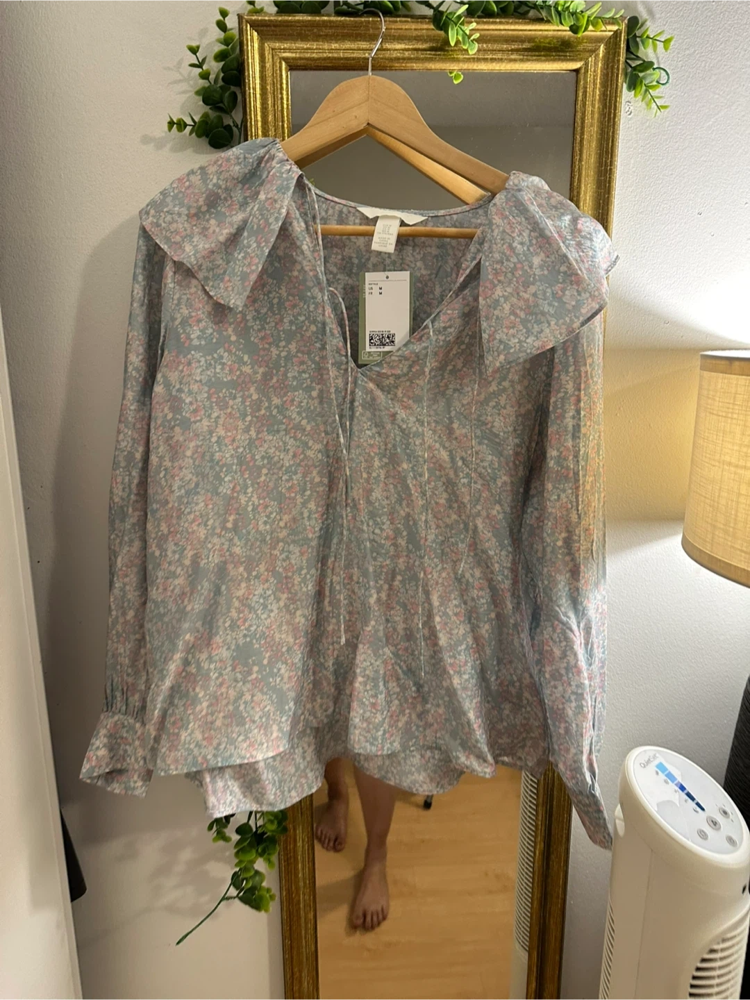 This H&M blouse features a lovely grey and pink floral print. It's a size medium with long sleeves and a tie neckline. The fabric is lightweight and airy!