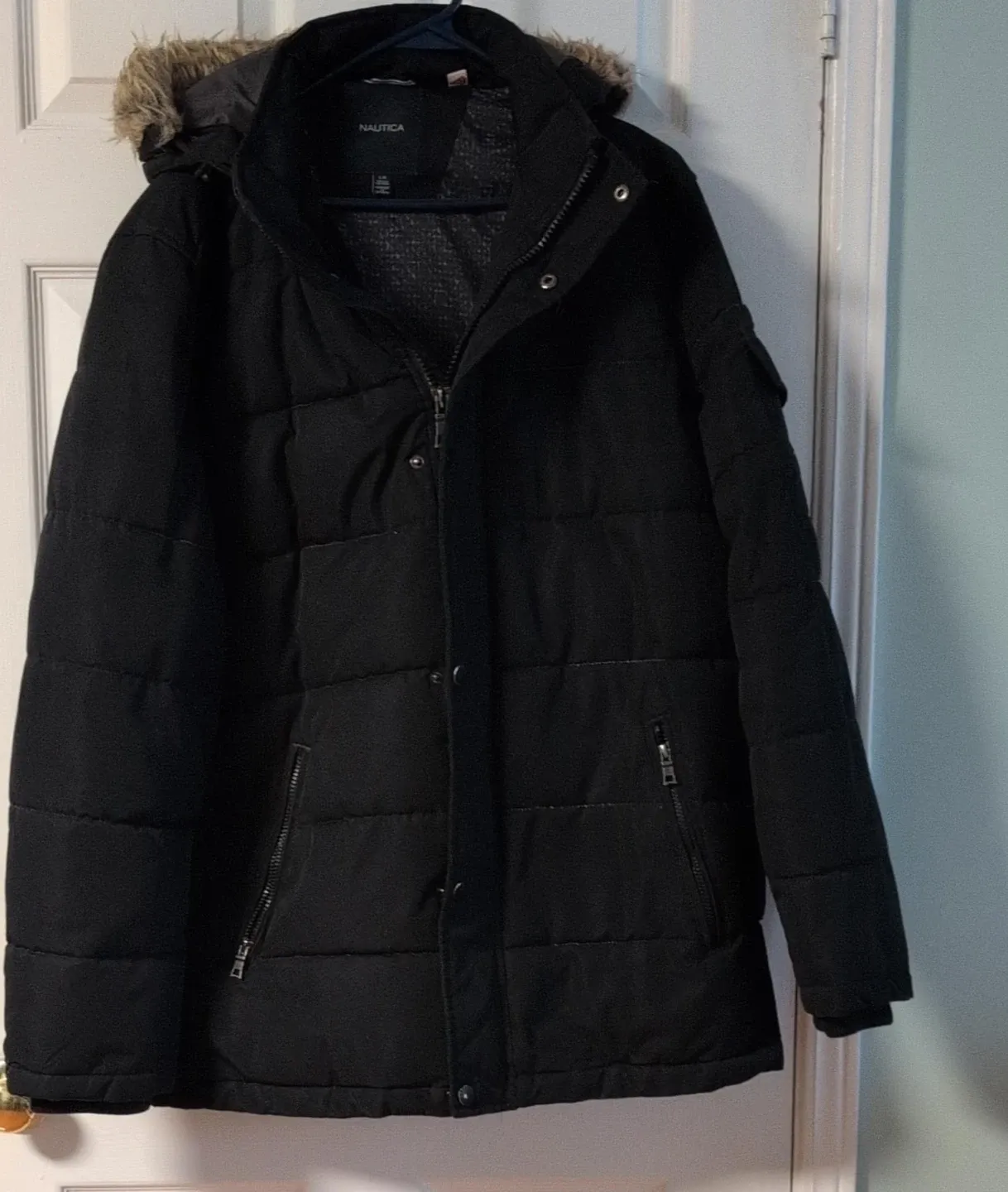Nautica puffer jacket in black. Features a removable fur-lined hood and a full zip closure with snap buttons. It's a warm winter coat, perfect for cold weather! Multiple zippered pockets included.