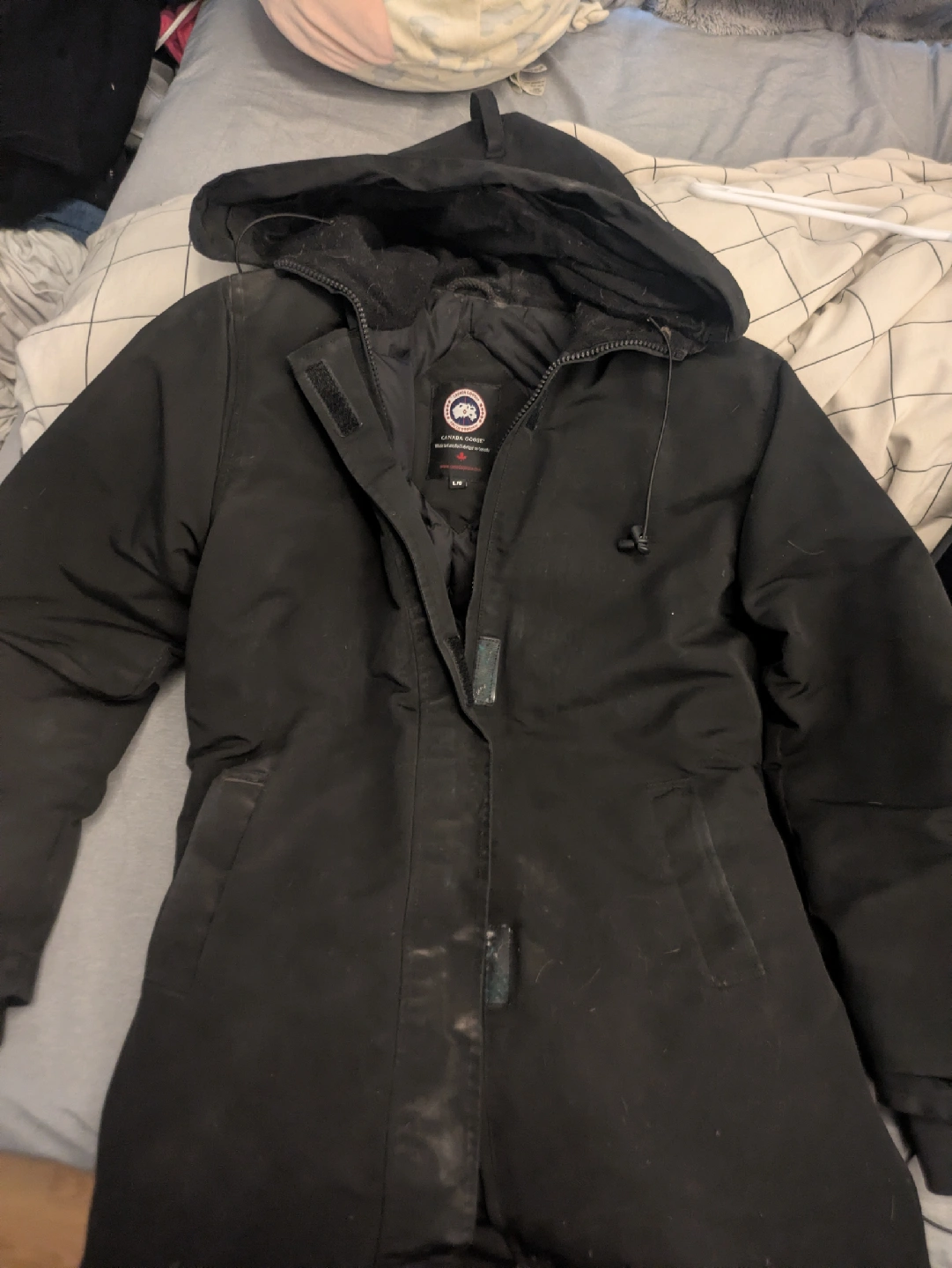 Selling a Canada Goose parka in black, size L/G. It's in good condition, just needs dry cleaning as it is a little dusty. ready to keep you warm this winter! Made in Canada. women