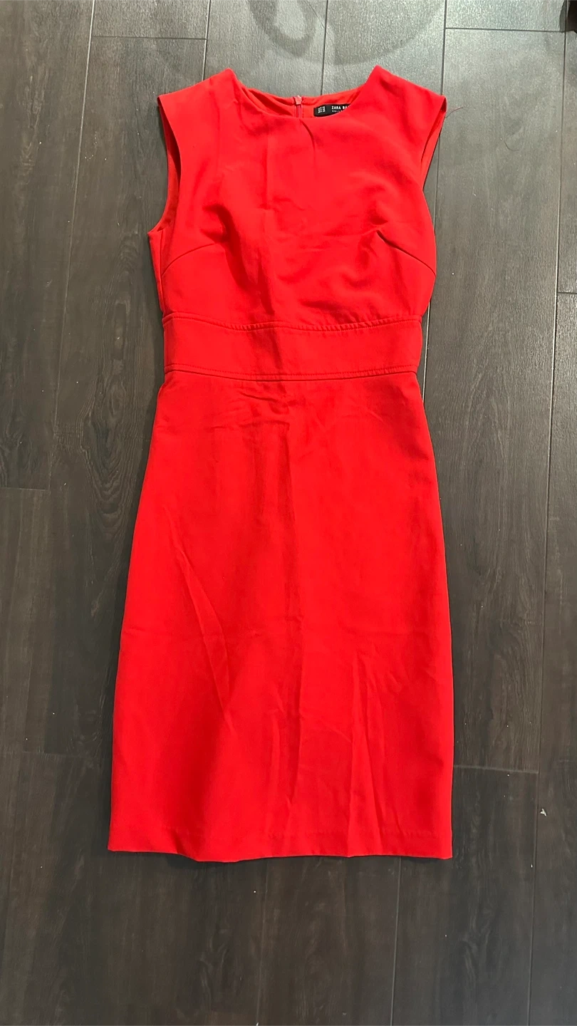 This classic red sheath dress features a flattering sleeveless design and a fitted waist. It's made from a durable fabric blend. Perfect for professional settings or an evening out!