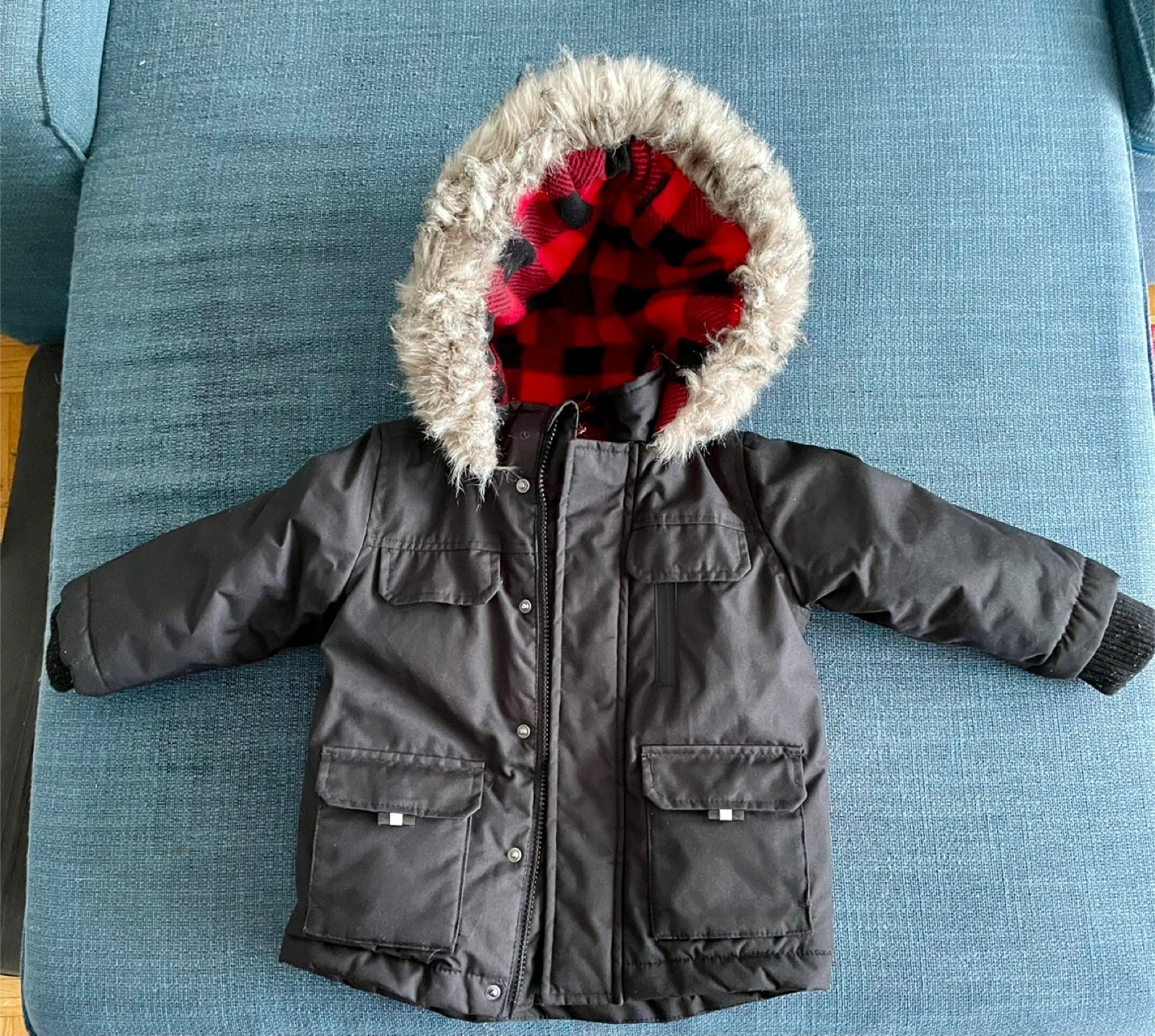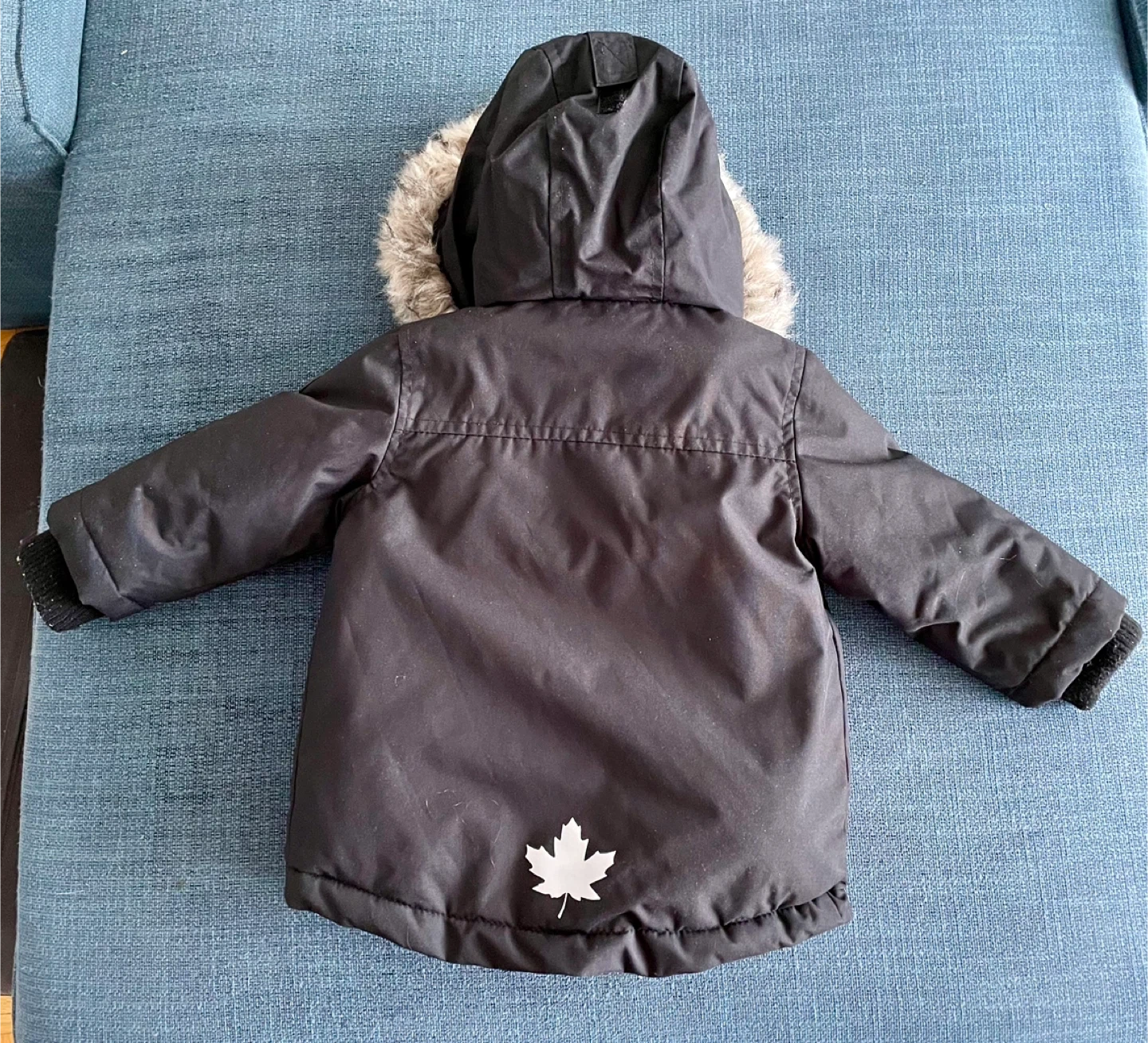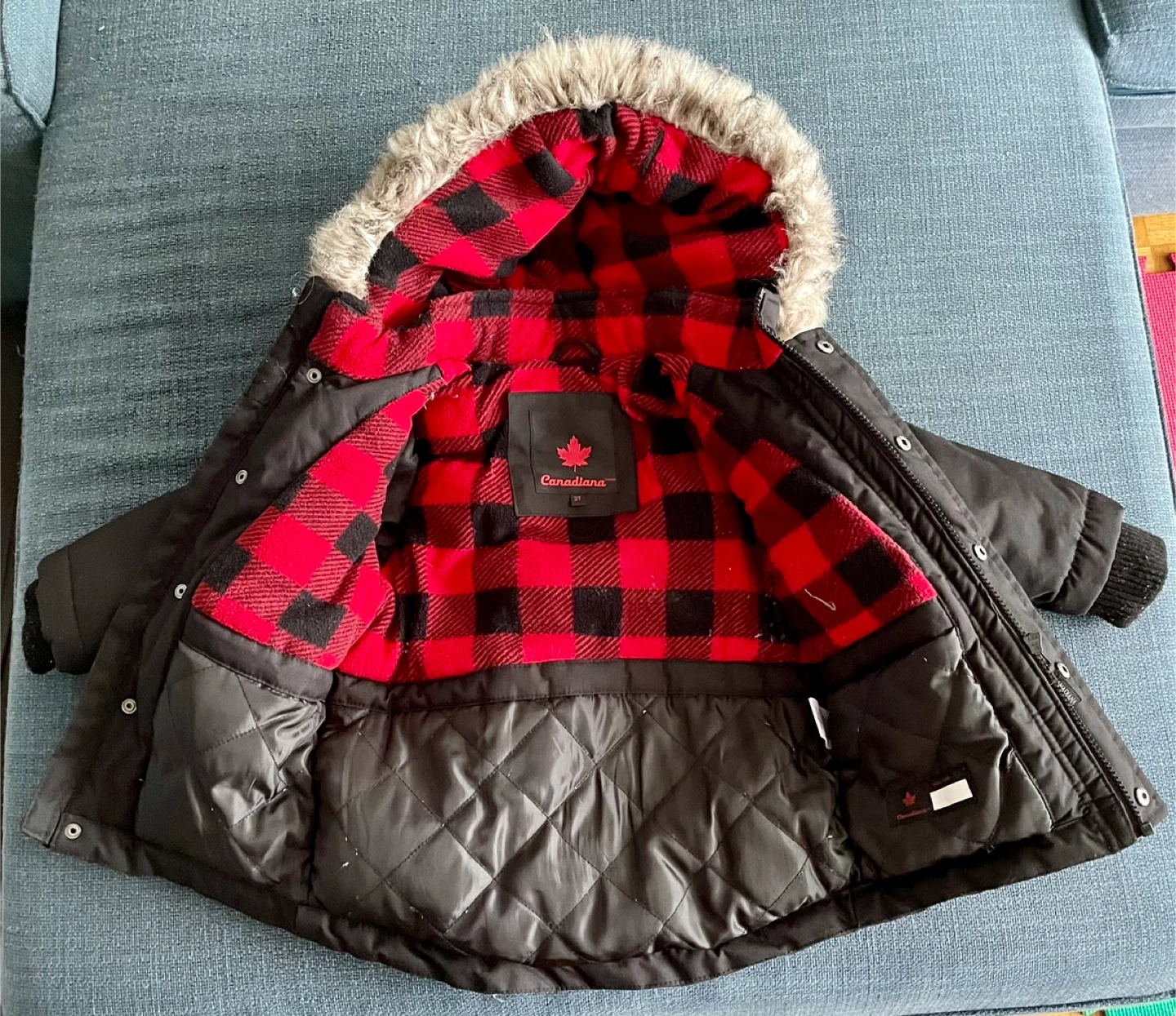 Selling a Canadiana winter jacket for kids in size 2T. It's black with a red and black plaid interior and a faux fur-trimmed hood. There's also a cute little maple leaf on the back