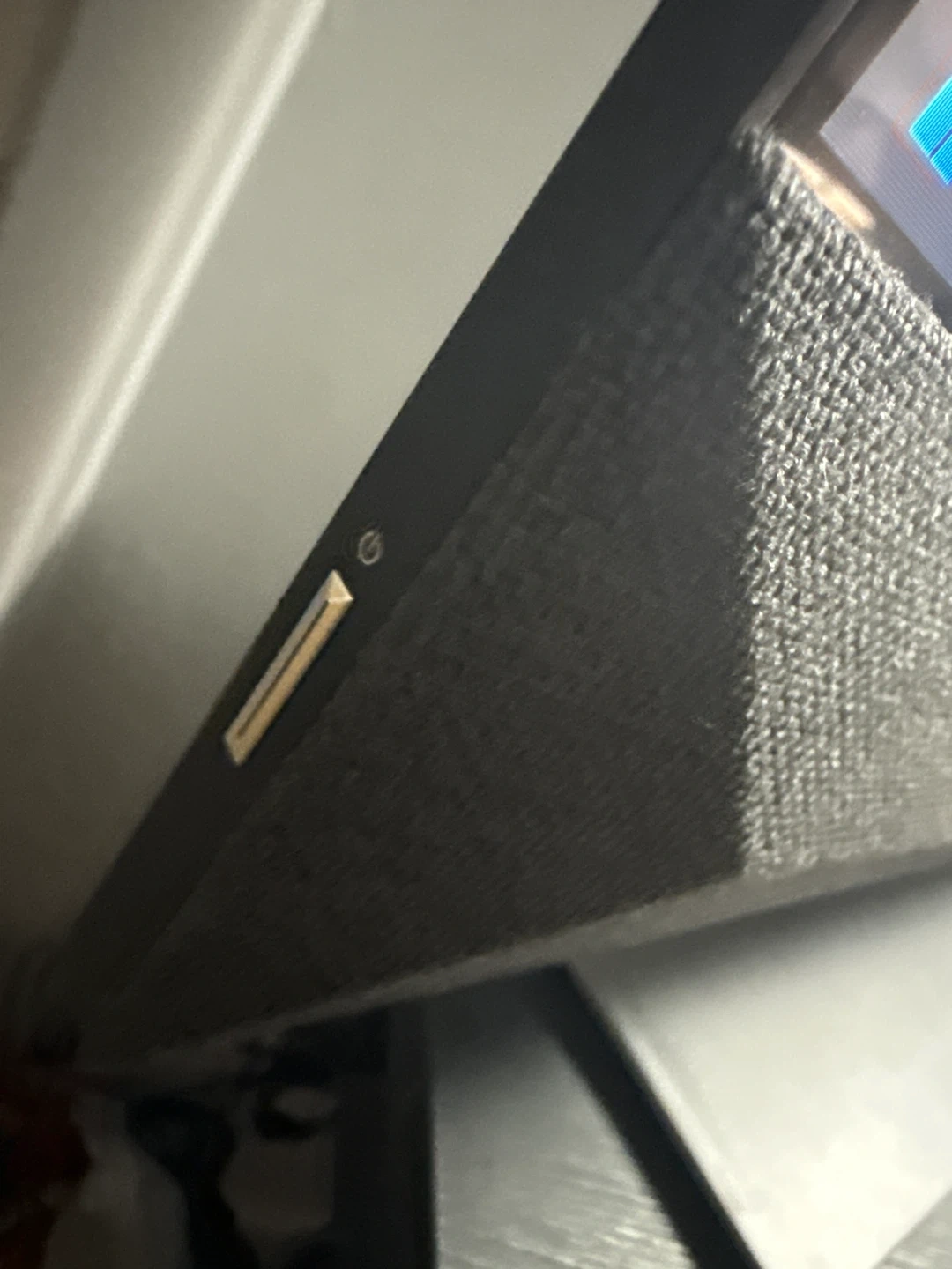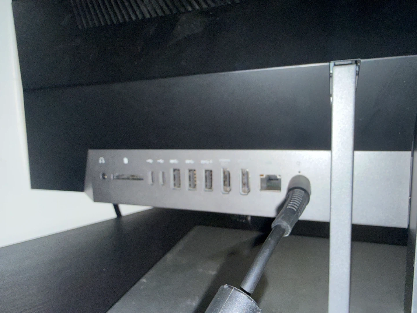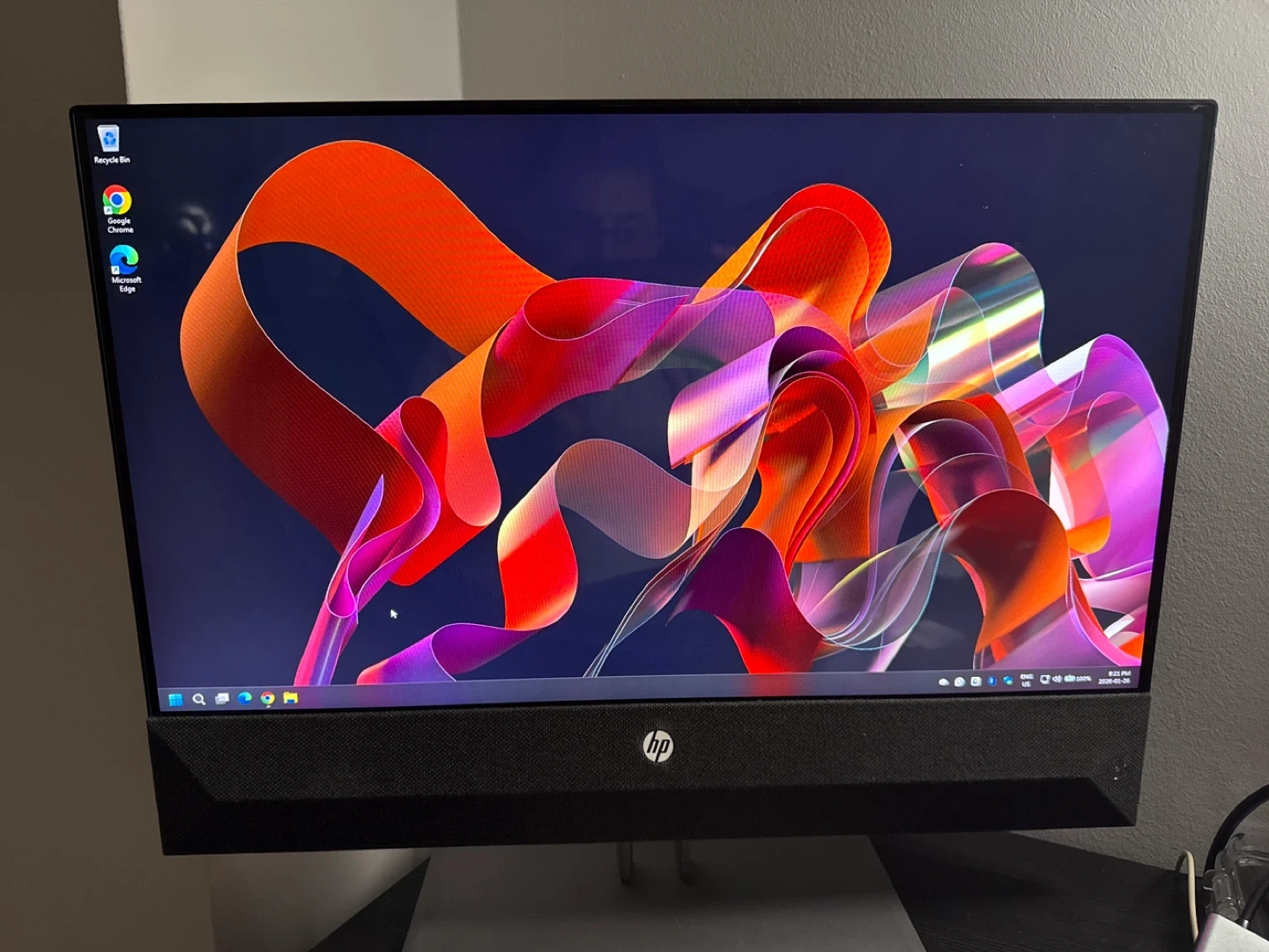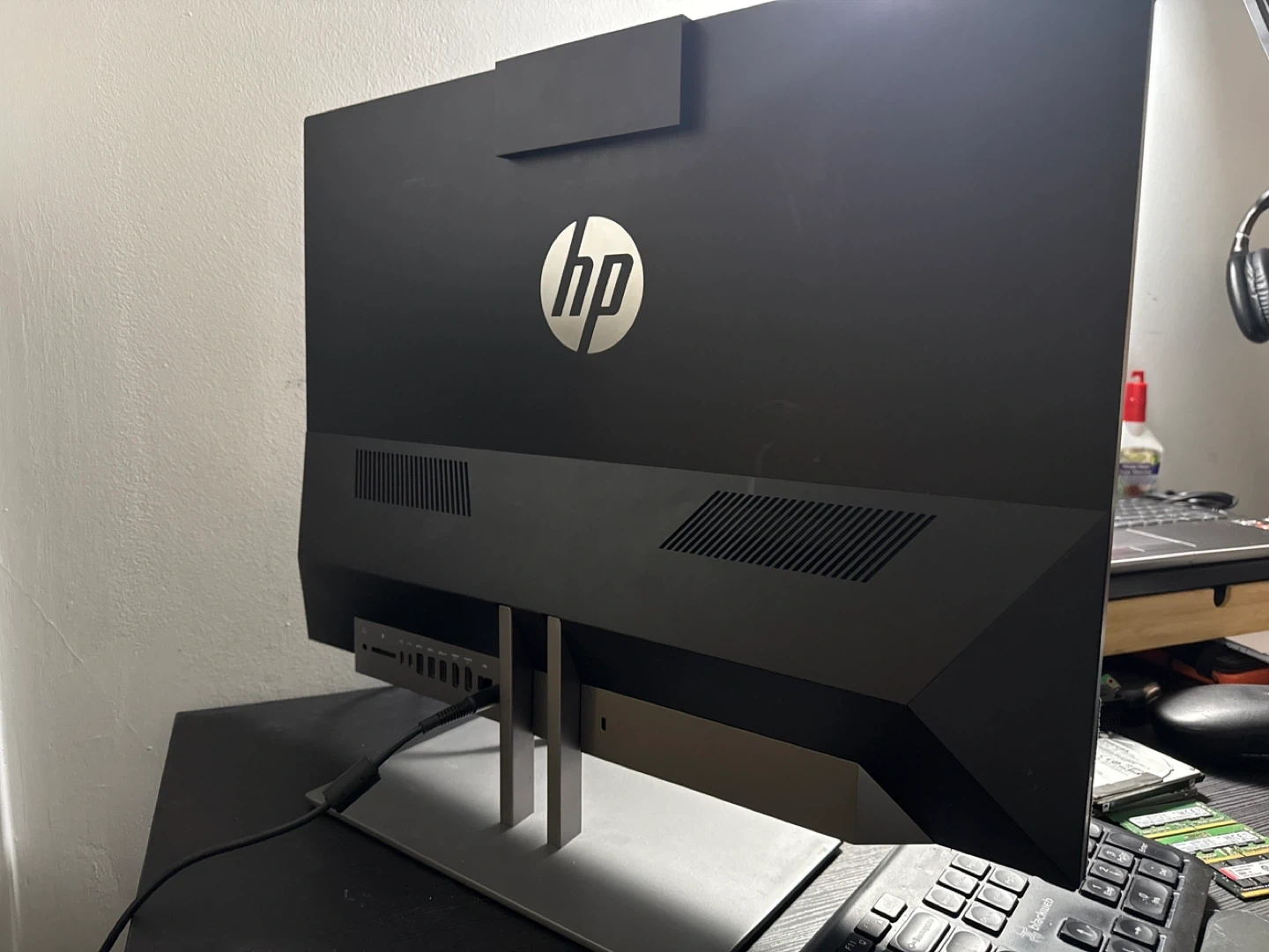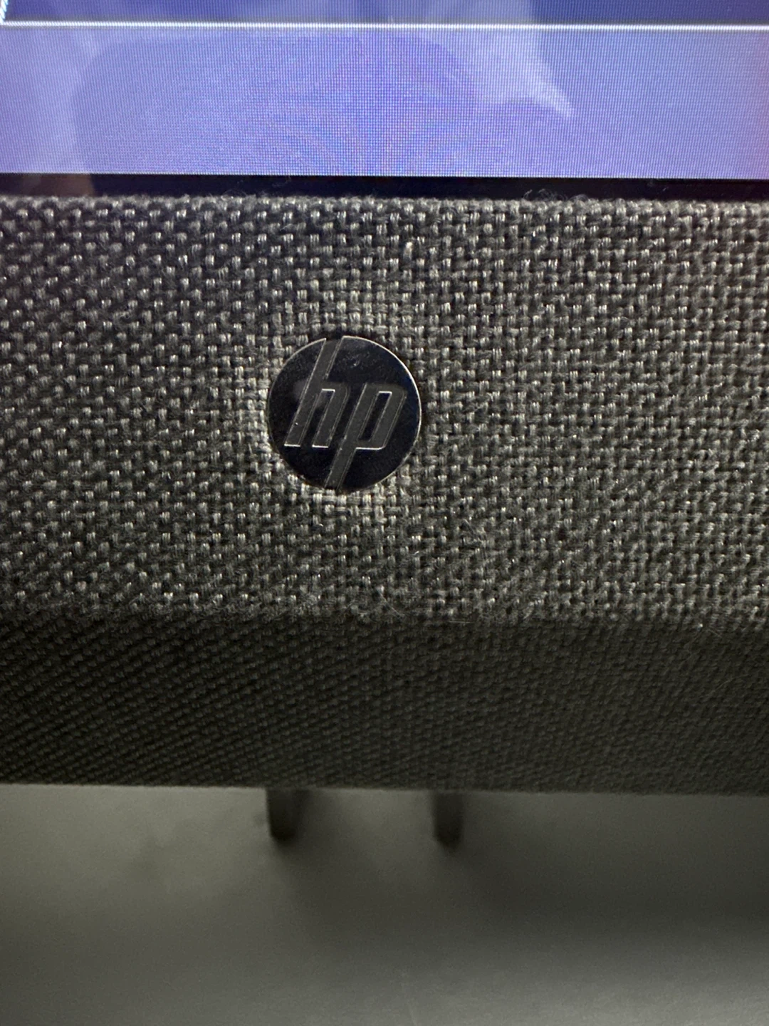 HP All-in-One desktop computer. It has a built-in speaker system. Power button is located on the side.