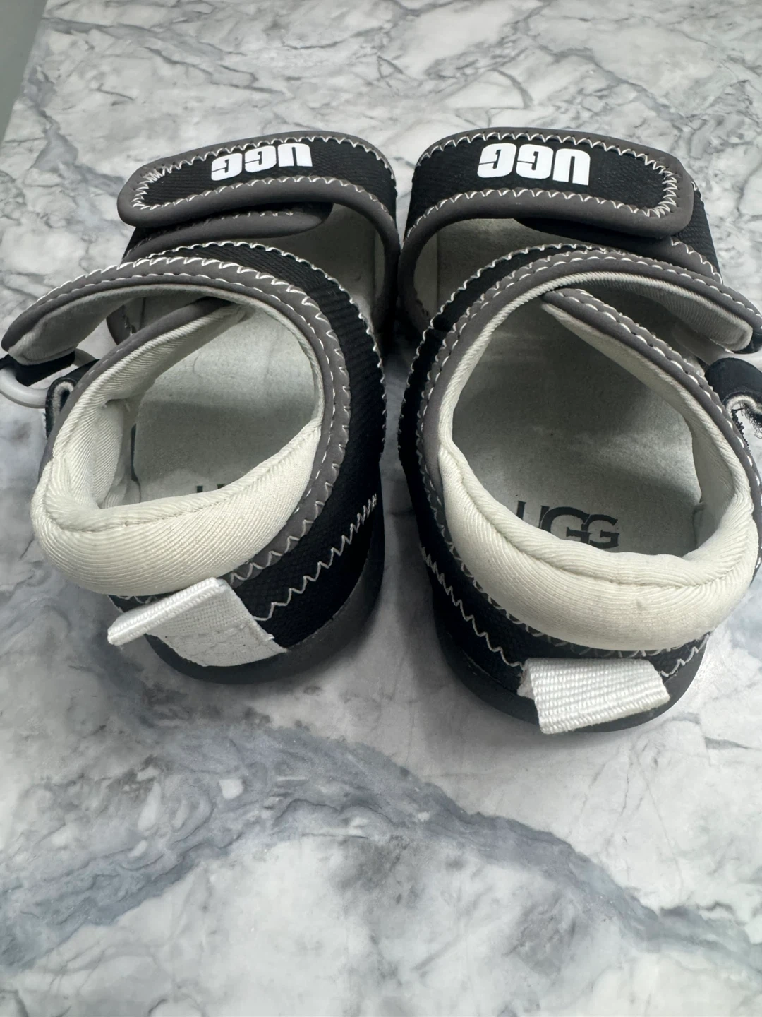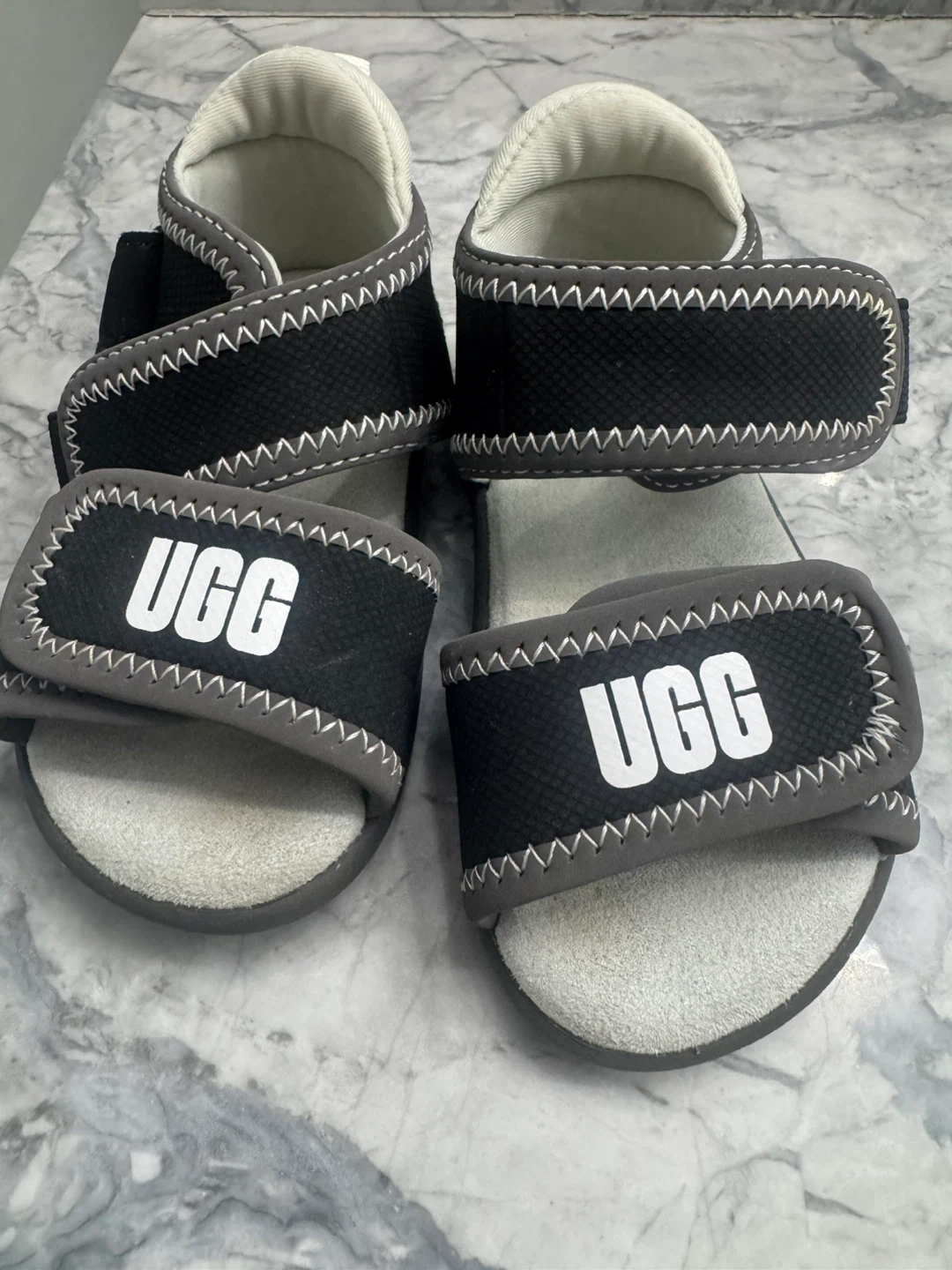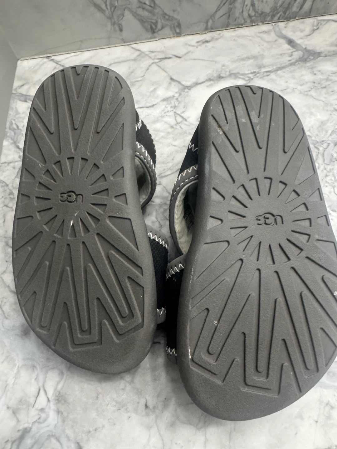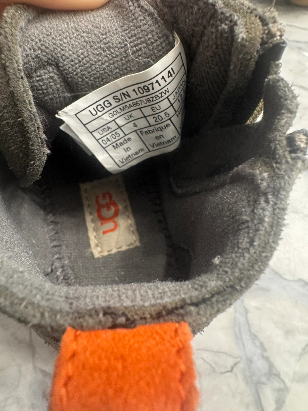 These UGG boots are grey suede with orange accents. They feature a side zipper and elastic laces for easy on and off. The soles have UGG branding. Perfect for toddlers transitioning to walking!