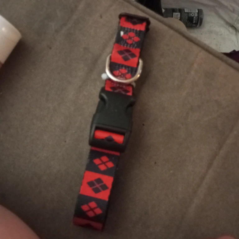 This dog collar features a red and black geometric pattern