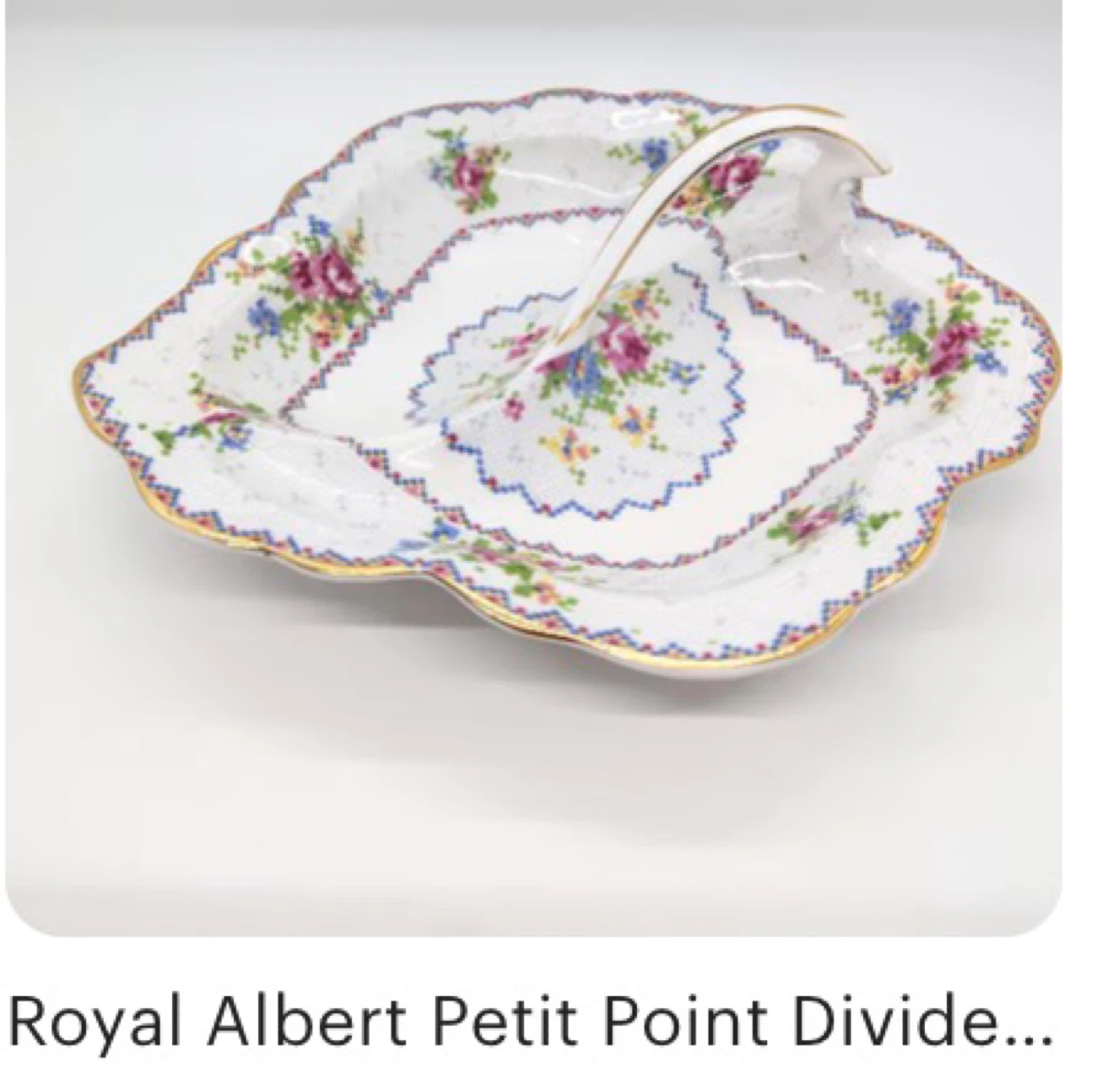 This is a vintage Royal Albert divided pickle dish. It can be hard to find. This piece features the charming Petit Point floral pattern.