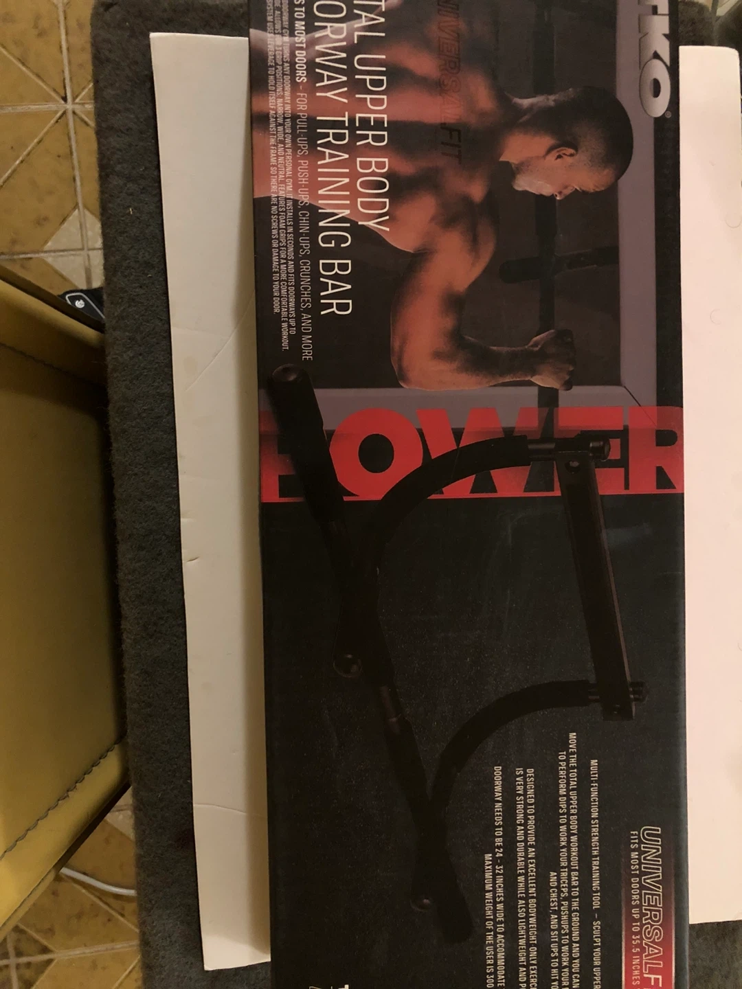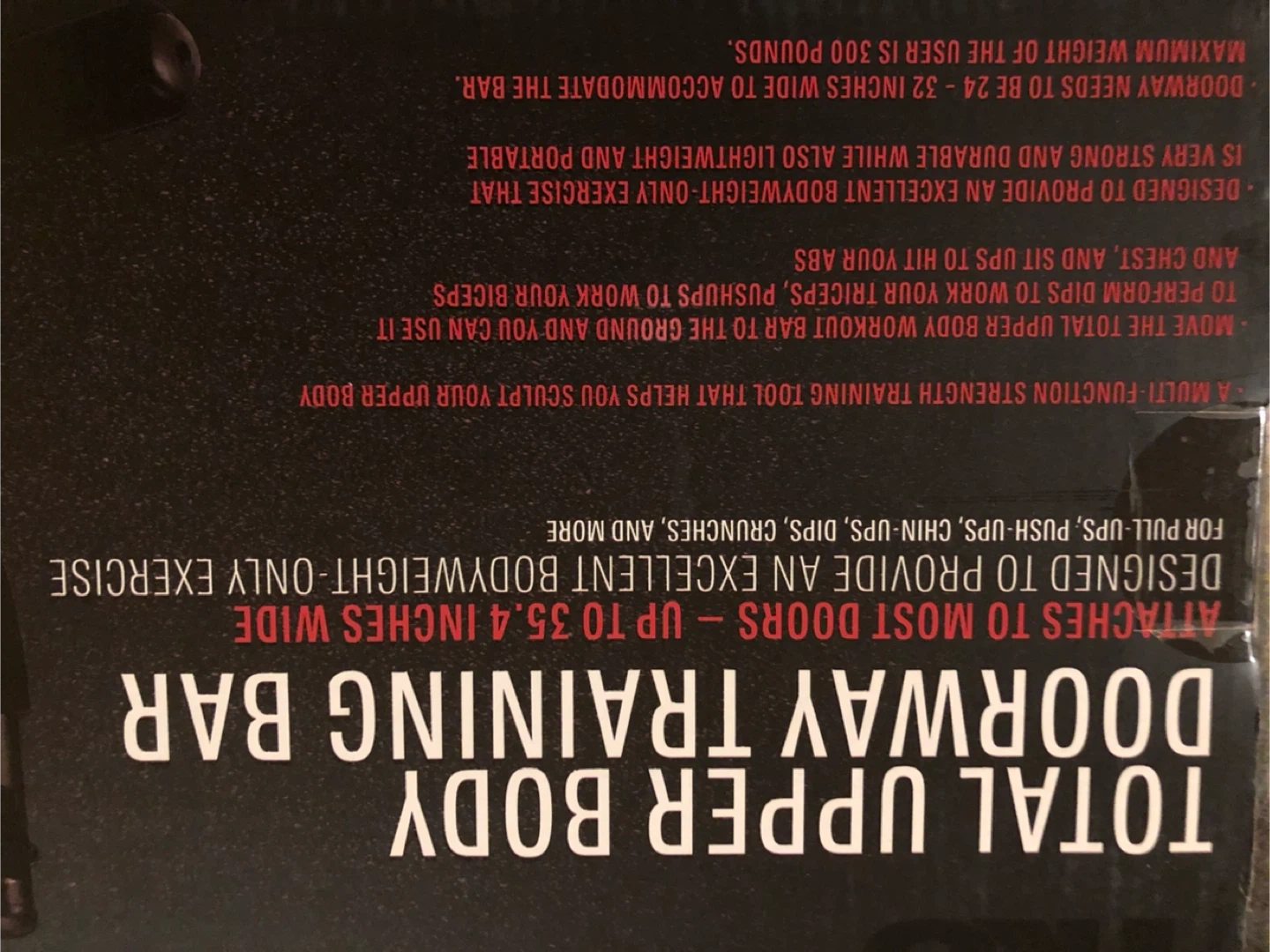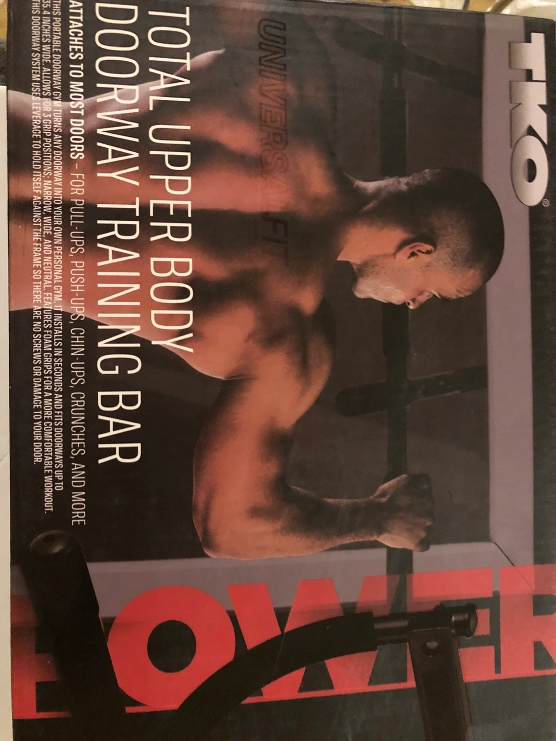 Get your workout on with this Universal Fit total upper body doorway training bar! It attaches to most doors, up to 35.4 inches wide, and supports a maximum user weight of 300 pounds. It's designed for pull-ups, push-ups, chin-ups, crunches, and more! The doorway needs to be 24-32 inches wide to accommodate the bar price is firm