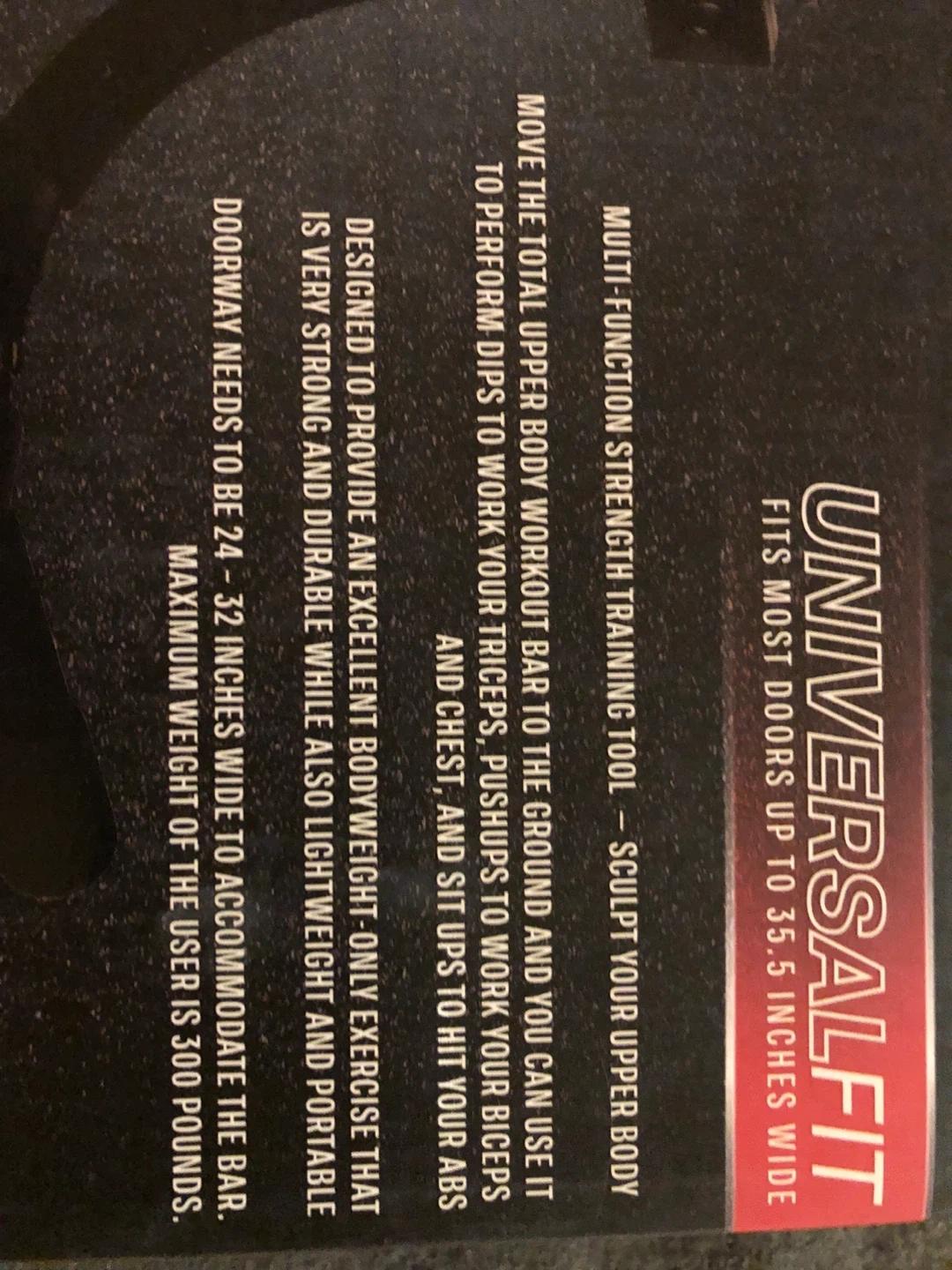 Get your workout on with this Universal Fit total upper body doorway training bar! It attaches to most doors, up to 35.4 inches wide, and supports a maximum user weight of 300 pounds. It's designed for pull-ups, push-ups, chin-ups, crunches, and more! The doorway needs to be 24-32 inches wide to accommodate the bar price is firm
