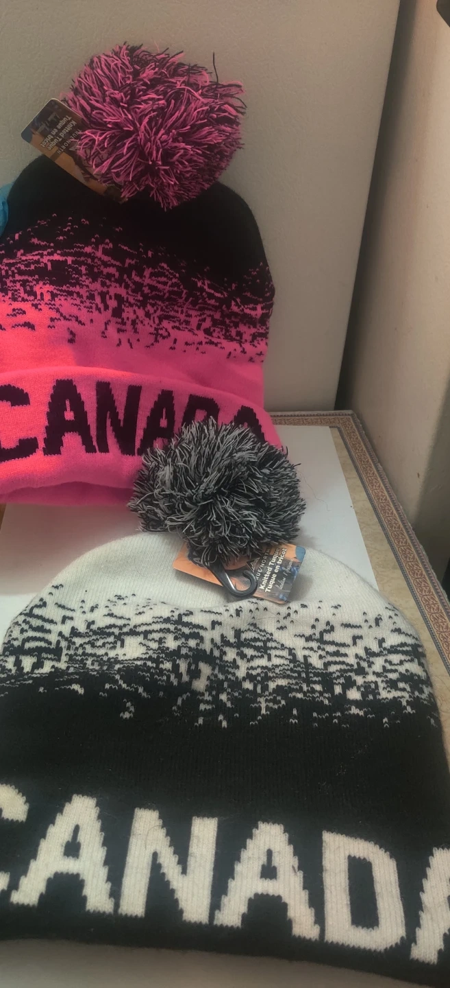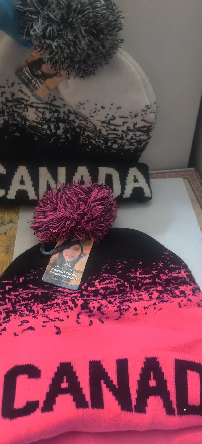 Two stylish knitted toques, one with a black and bright pink gradient and the other black and white. Both feature a 'CANADA' graphic and a pom pom on top. Perfect for staying warm during colder months!price is for both