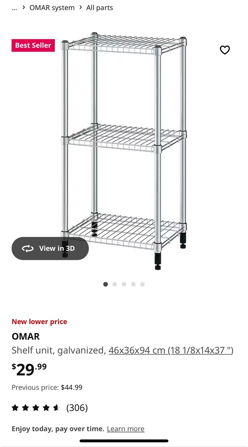 Buy & SellIKEA OMAR 3-Shelf Shelving Unit _ASAP PICK UPIKEA OMAR 3-Shelf Shelving Unit _ASAP PICK UP$603 type of OMAR Shelving Unit Only pick up and cash retail price $200 all of 3 OMAR $60 can pick up until the 29 aprilConditionLike newWHERE TO MEETCheck LocationView MapSELLERverifiedcoCorktown15412 reviews2 chats·3 favorites·64 viewsSEND CHAT TO SELLERHi co! I’m interested in your listing.Hi co! I’m interested in your listing.Get the Karrot app to chatSign In to chat