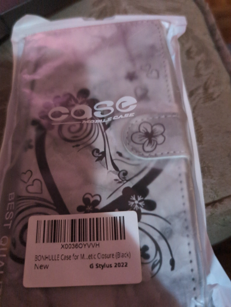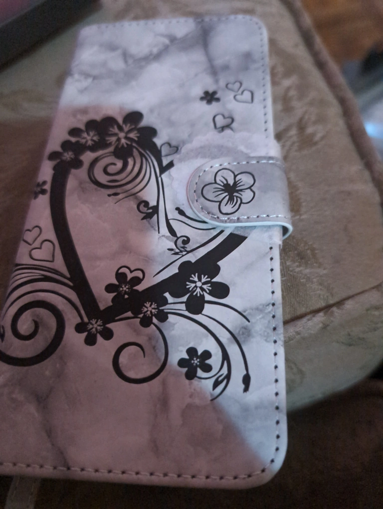 New, never used phone case. Magnetic closure. Features a marble-like design with a black floral heart. Includes wrist strap. For G Stylus 2022.