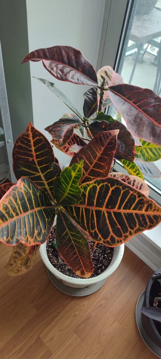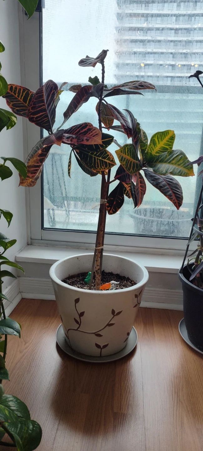 A vibrant croton plant in a white pot with a decorative vine pattern. This plant has striking multi-coloured leaves. It's potted and ready to brighten up your space! Bring a touch of nature indoors with this eye-catching specimen.