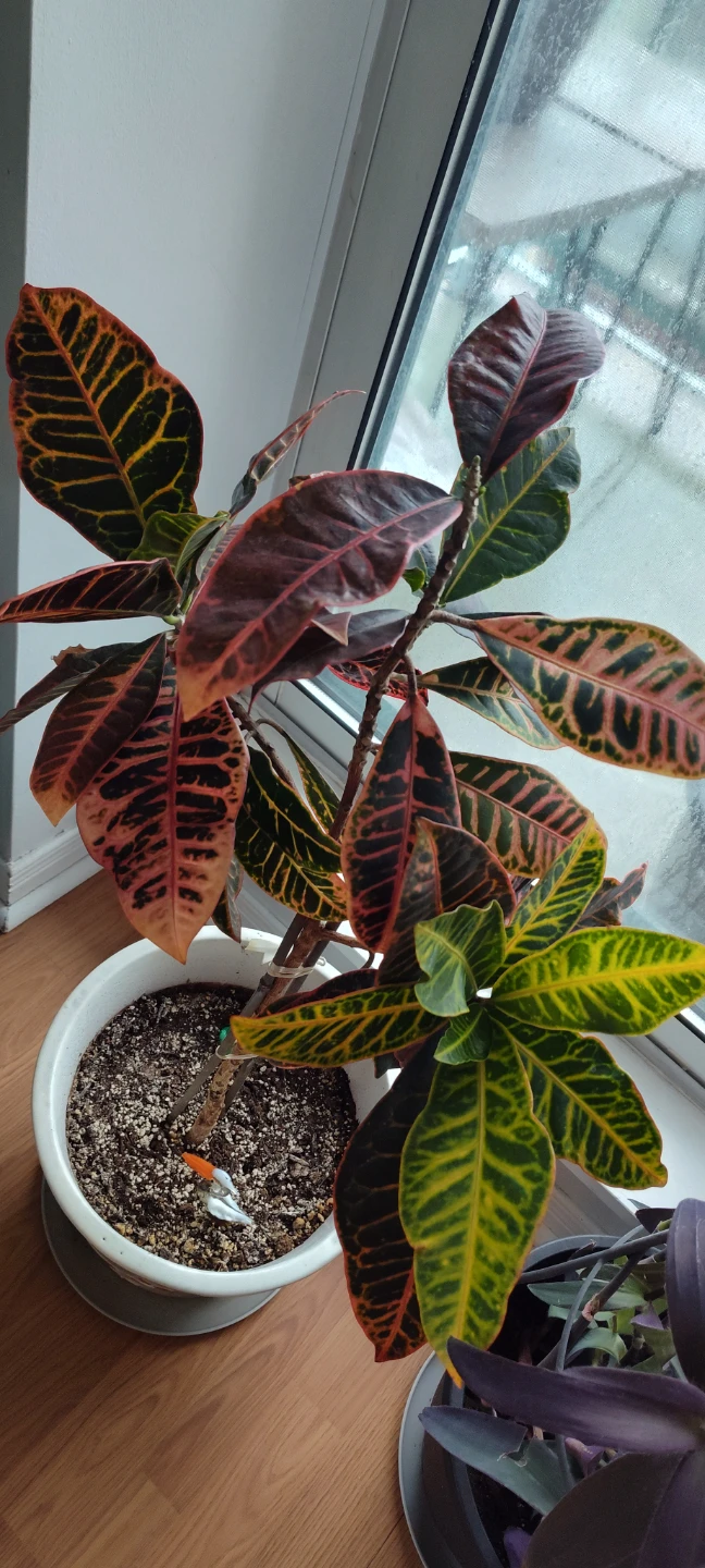 A vibrant croton plant in a white pot with a decorative vine pattern. This plant has striking multi-coloured leaves. It's potted and ready to brighten up your space! Bring a touch of nature indoors with this eye-catching specimen.