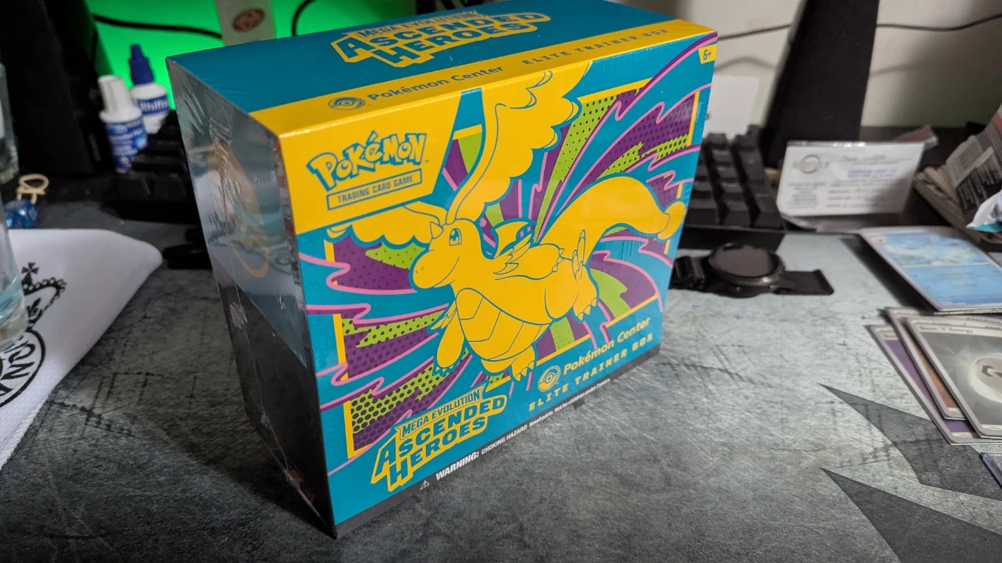 This is a Pokémon TCG Mega Evolution Ascended Heroes PC Elite Trainer Box, featuring Dragonite. It includes booster packs, energy cards, and card sleeves.