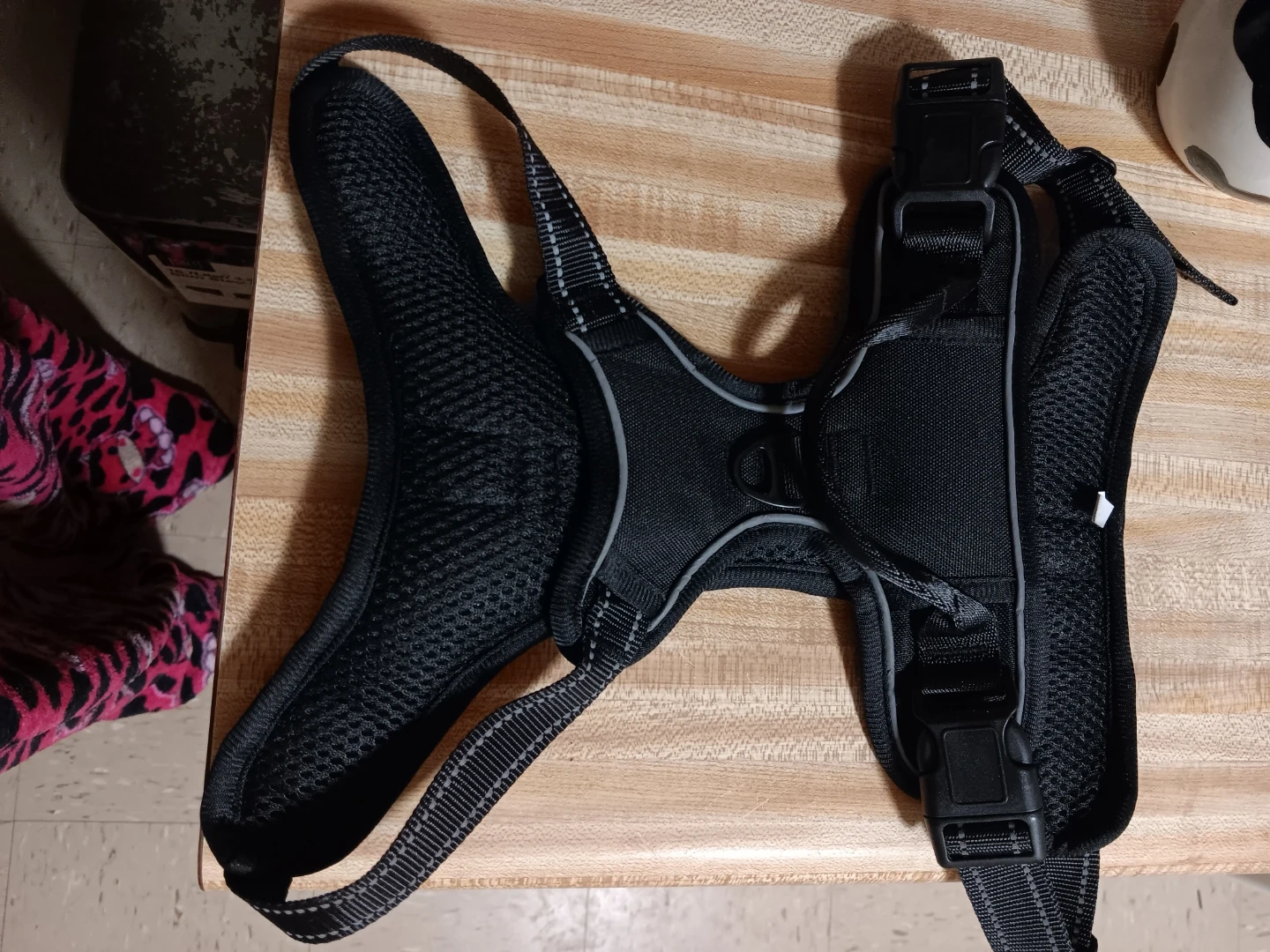 This black padded dog harness offers a comfortable fit for your pet. It features adjustable straps and reflective accents for visibility. Padded chest and back panels ensure comfort during walks.