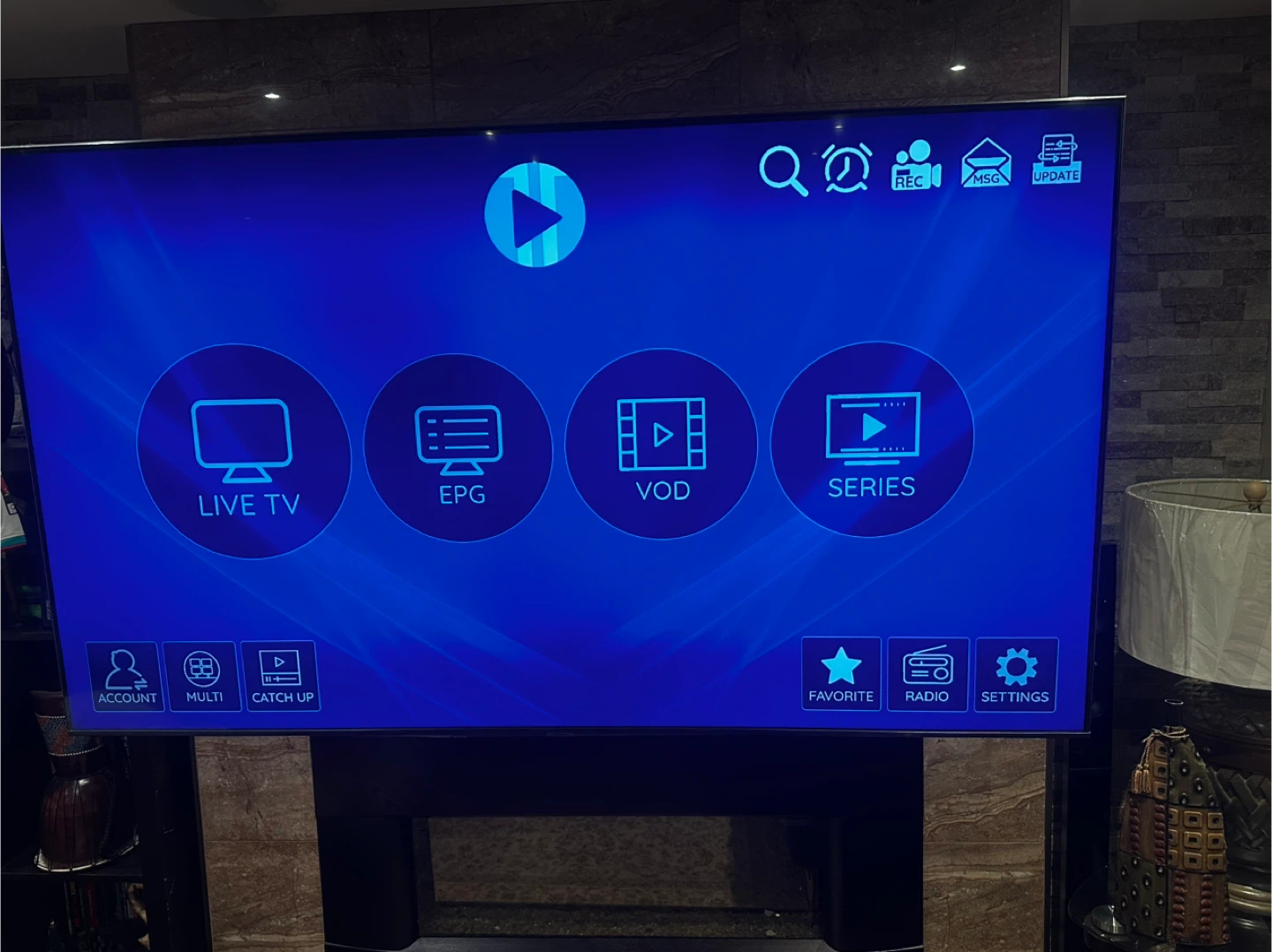 Selling a smart TV that features options for Live TV, EPG (Electronic Program Guide), VOD (Video On Demand), and Series. It also has settings for account, multi-view, catch-up, favorites, and radio