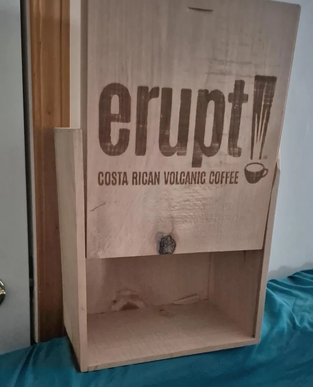 This is an Erupt! wooden display box for Costa Rican Volcanic Coffee. It's made of light-coloured wood and features the Erupt! logo and branding. This box would be useful for displaying coffee bags or other small items.