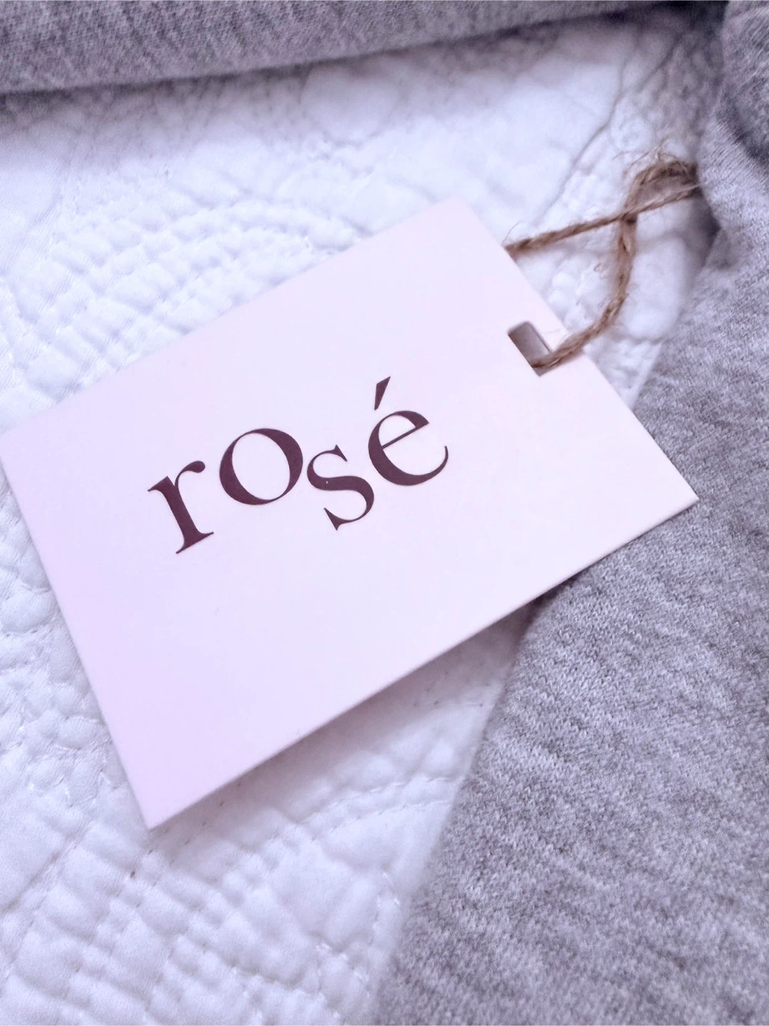 This Rosé grey sweatshirt and shorts set is made of 80% cotton and 20% polyester. The set is size XL/TG. It's perfect for lounging or casual wear. Machine wash in cool water.