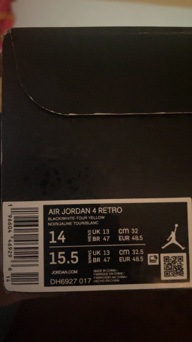 Air Jordan 4 Retro sneakers in black with tour yellow accents. Men's size 14 (US) / 15.5 (WMNS) with original box included.