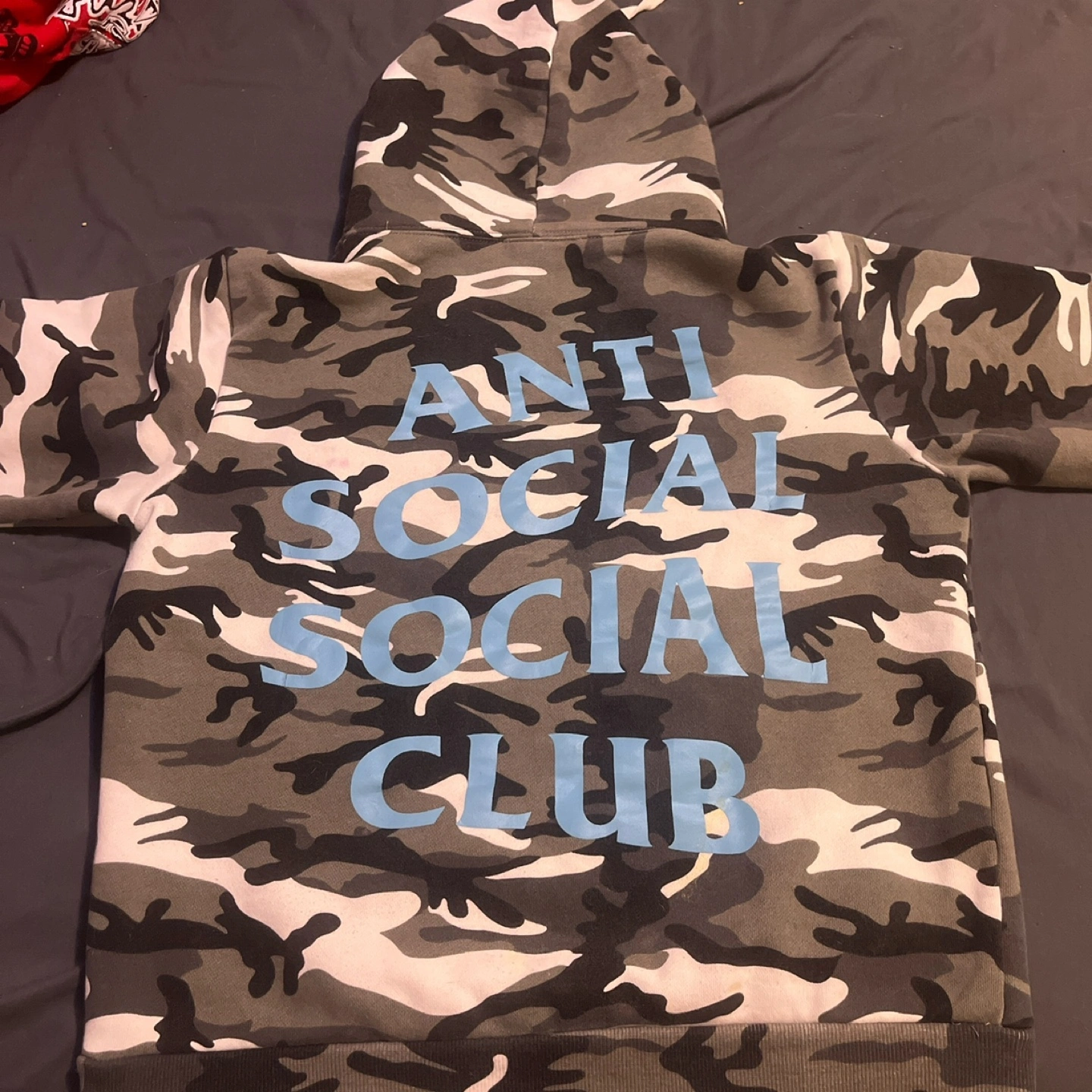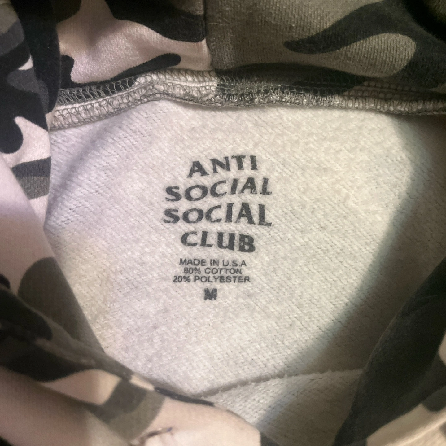 This is an Anti Social Social Club hoodie in size medium. It's made with 80% cotton and 20% polyester. This hoodie features a classic camouflage pattern. It's great for casual wear!