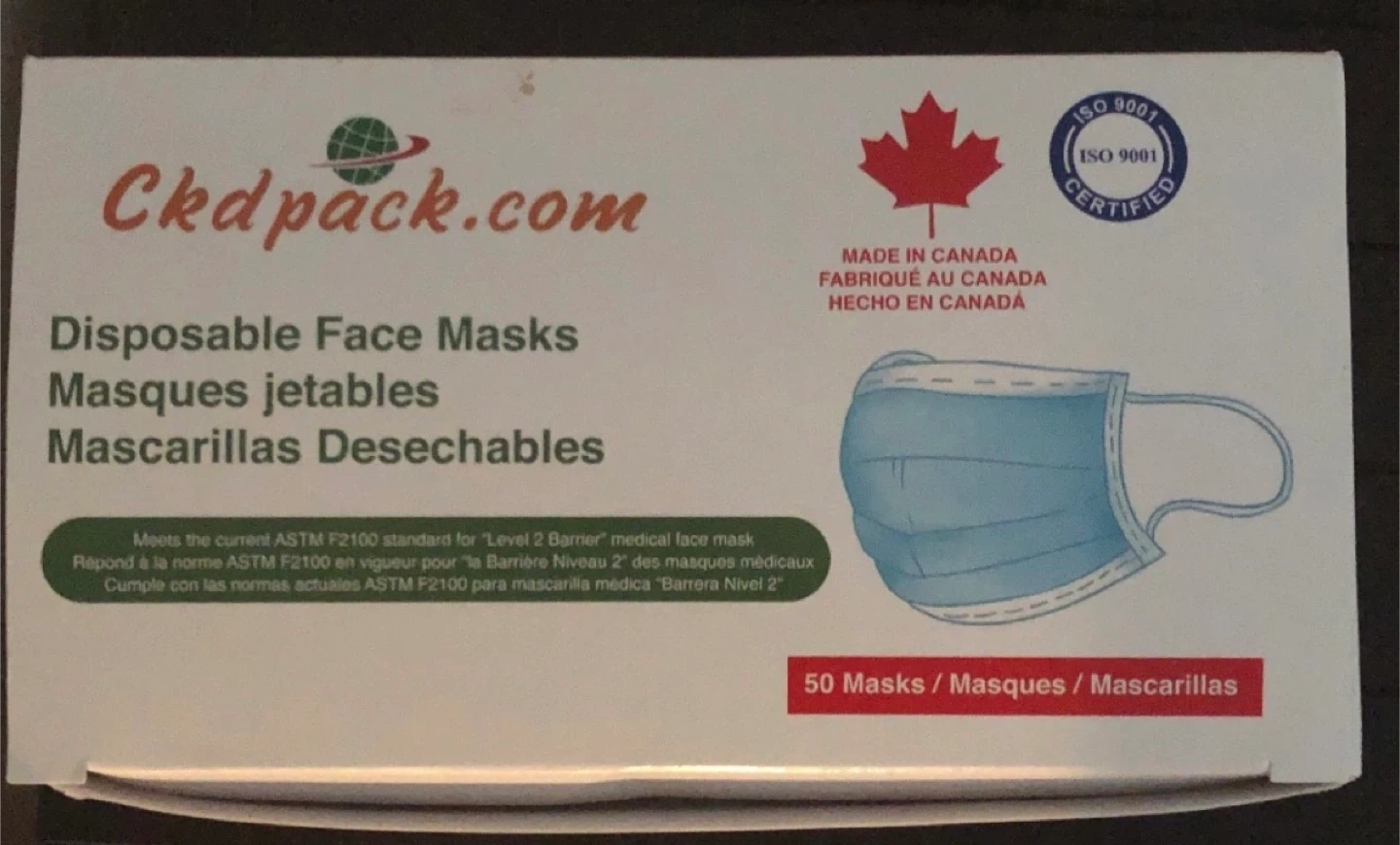 Box of 50 disposable face masks. Made in Canada and meets ASTM F2100 "Level 2 Barrier" medical face mask standard. ISO 9001 certified product. These masks are suitable for medical and normal use.