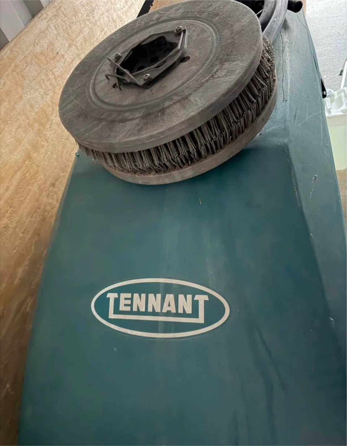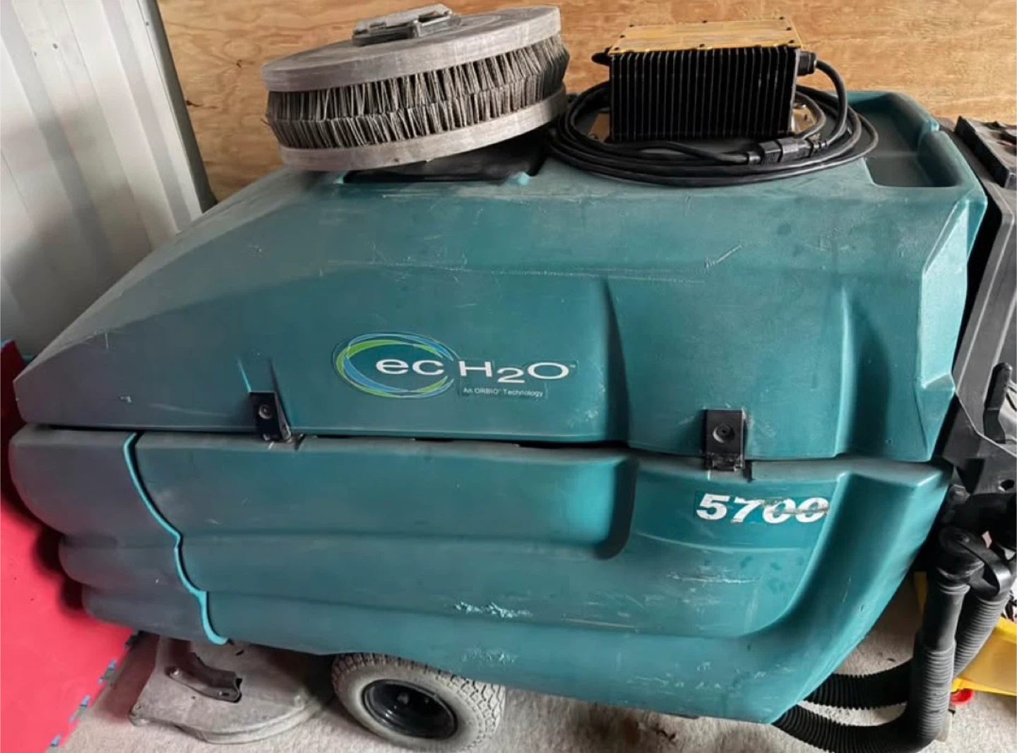 This is a Tennant 5700 floor scrubber. It comes with a brush and a charger. The ec-H2O technology is a water-saving system.