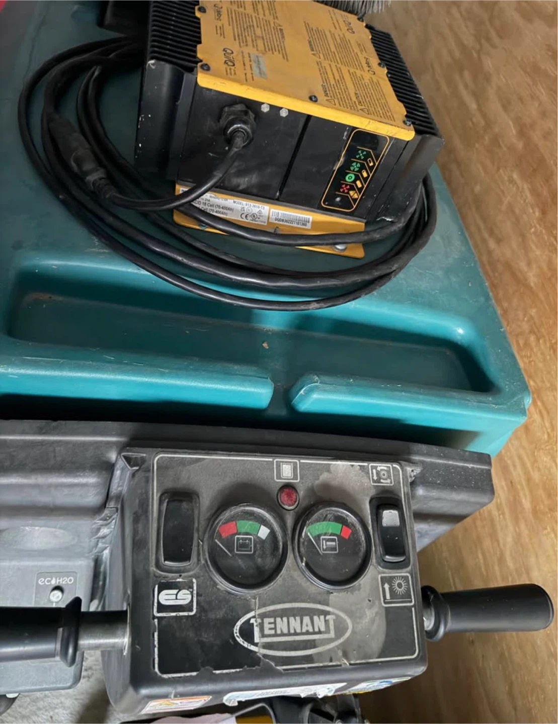 This is a Tennant 5700 floor scrubber. It comes with a brush and a charger. The ec-H2O technology is a water-saving system.