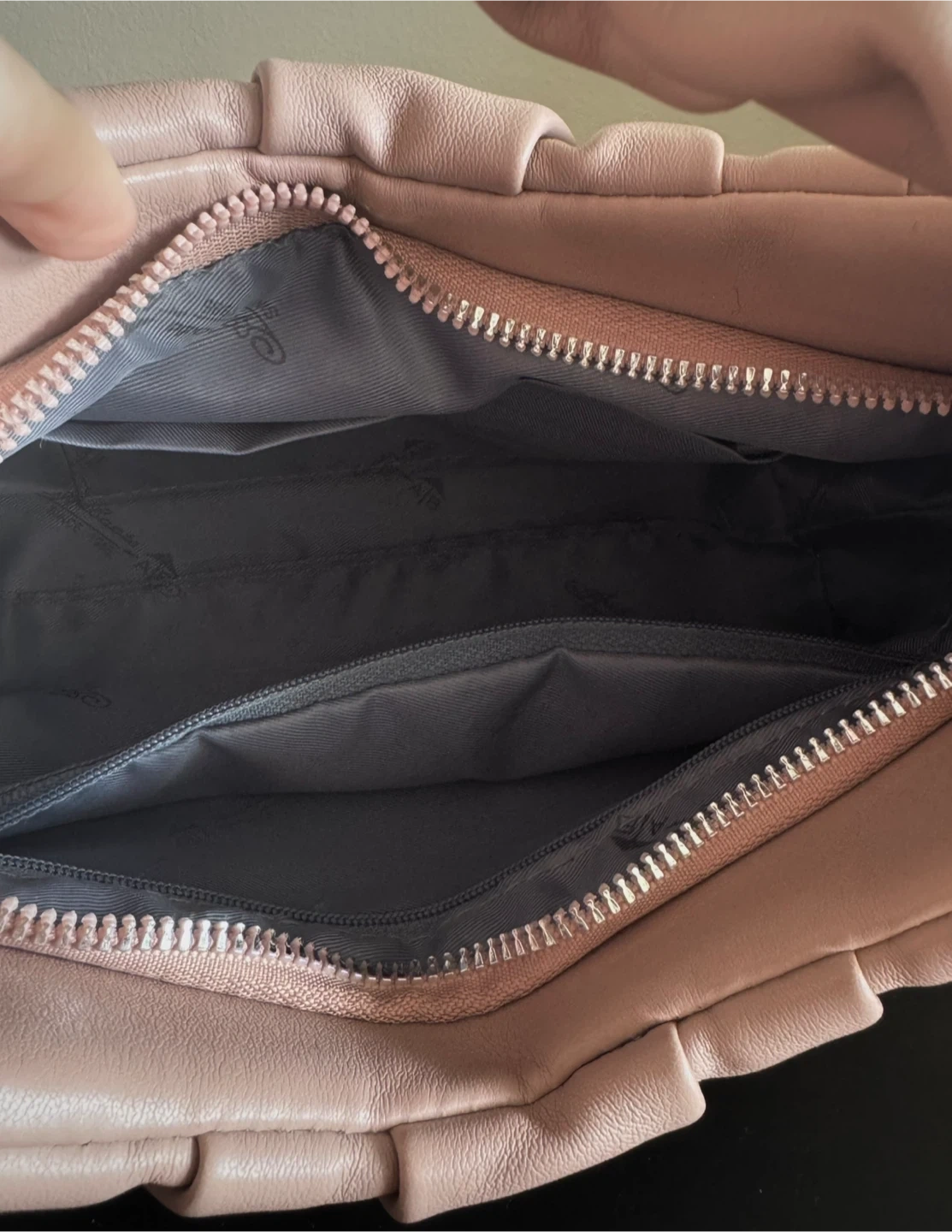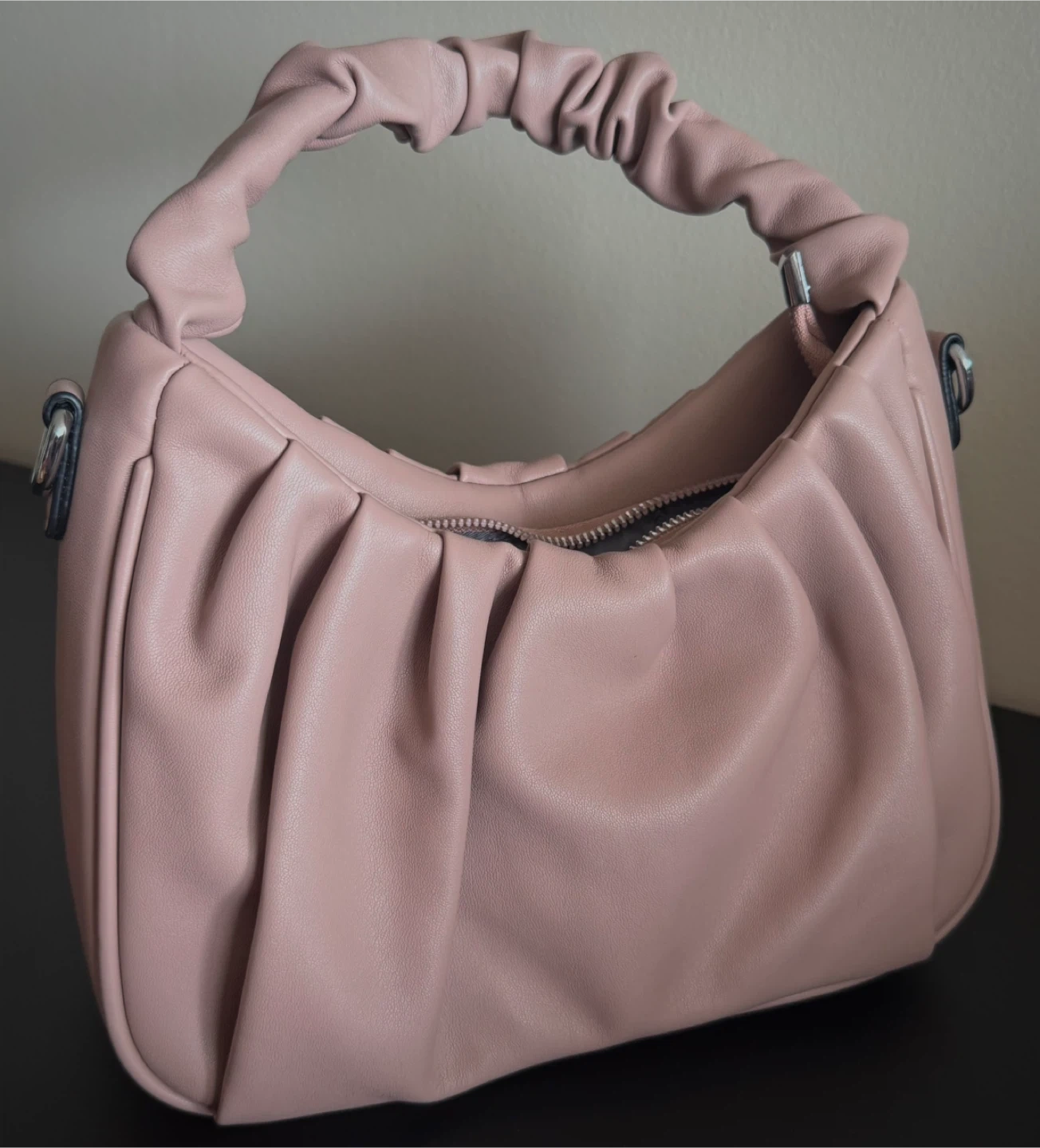 A stylish pink handbag with a ruched design and a comfortable handle. It has a zippered closure for security. This bag is perfect for carrying your essentials.