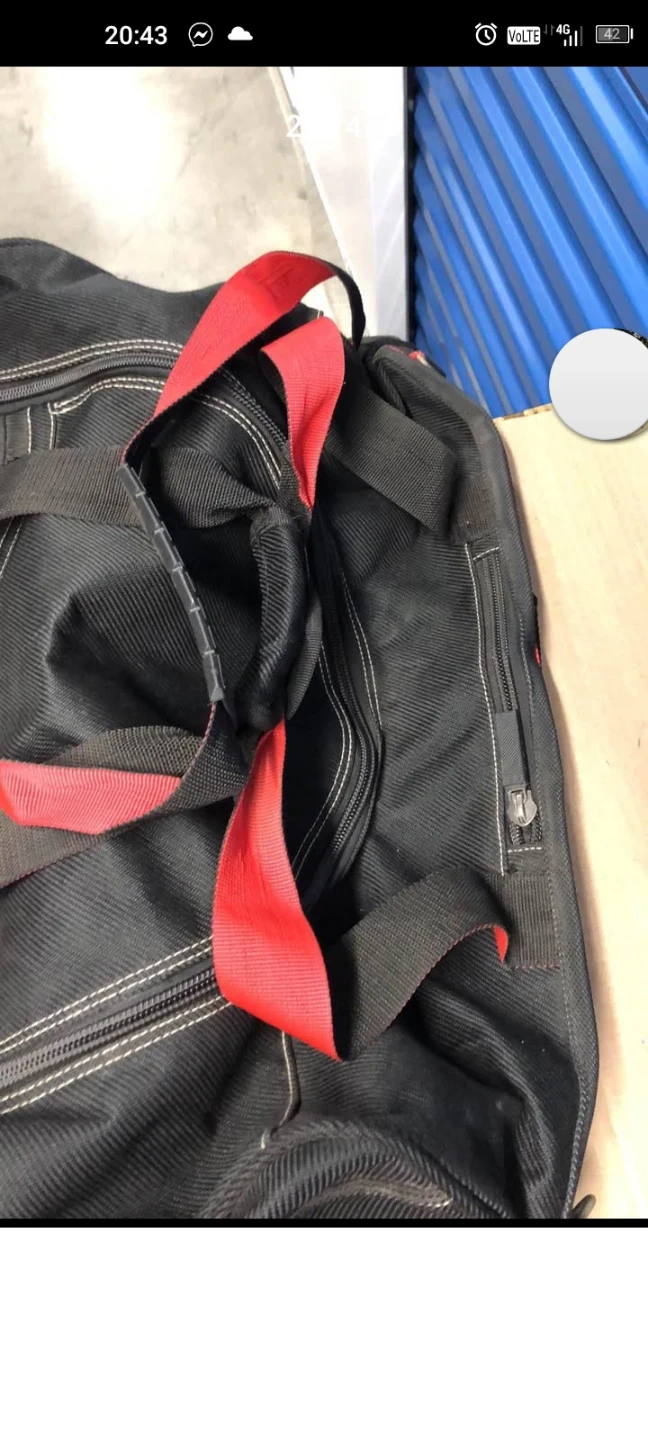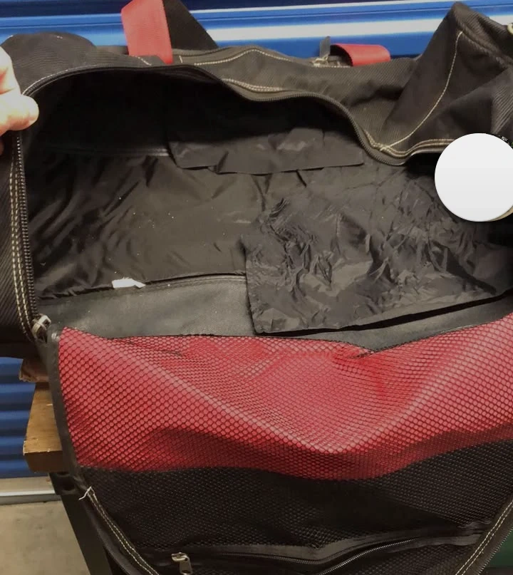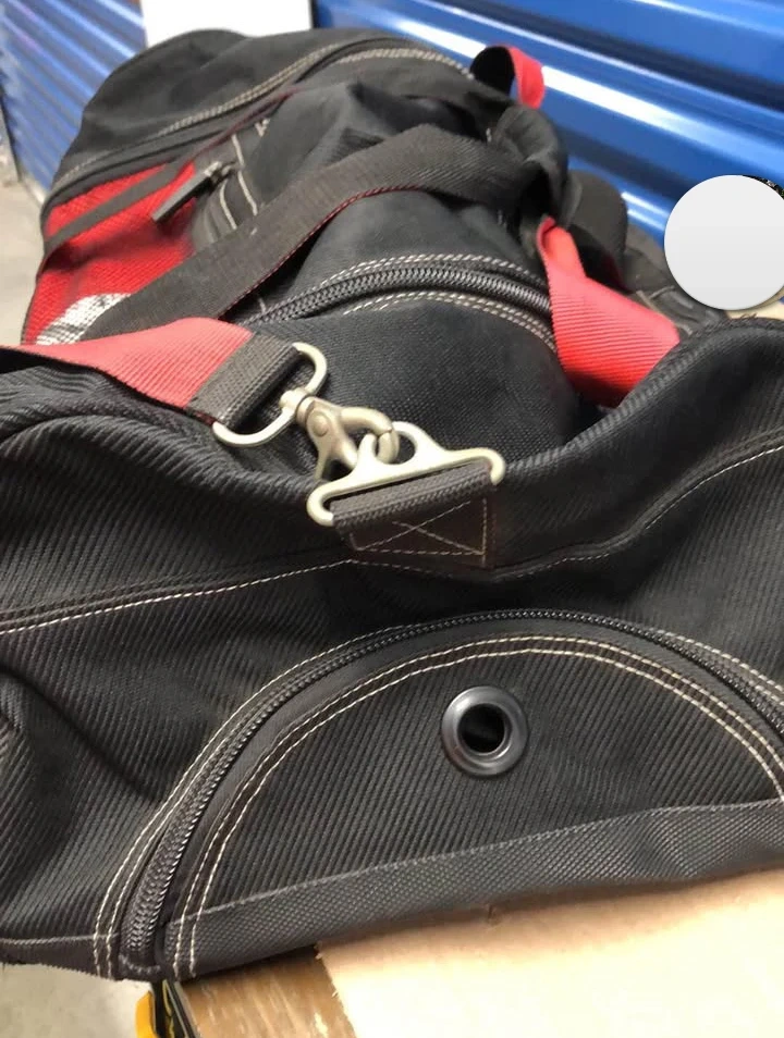 This is a black duffel bag with red strap accents. It features multiple zippered compartments and durable fabric construction. The interior is lined and includes organizational pockets. Great for travel or sports gear!