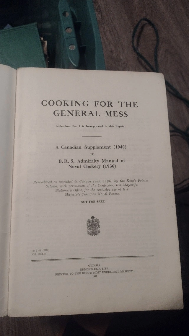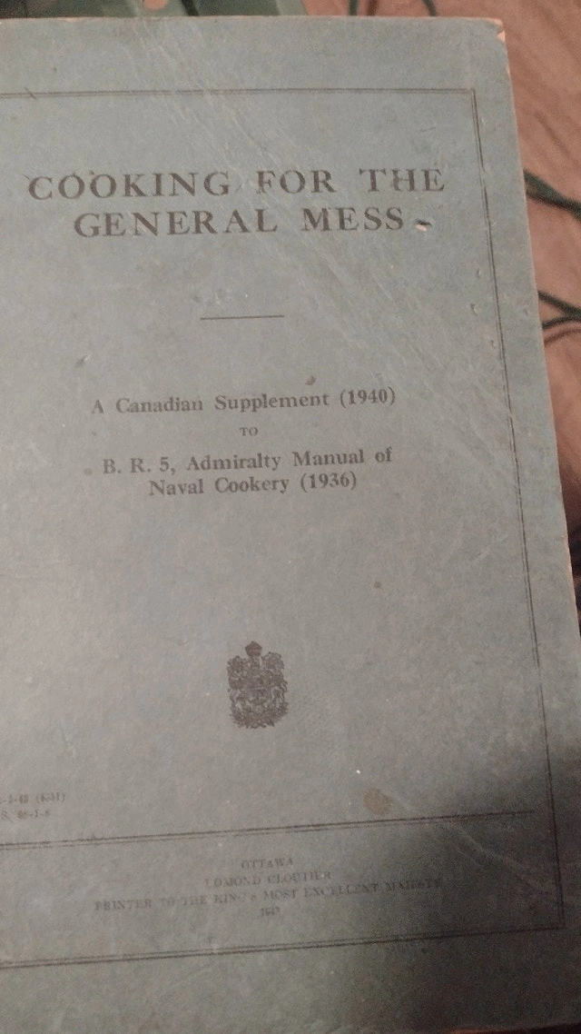 This is the vintage cookbook 'Cooking for the General Mess - A Canadian Supplement (1940)'. It's a manual of naval cookery and a historical military cookbook. Condition is Used - Good. Vintage, Antiques.