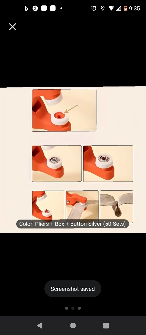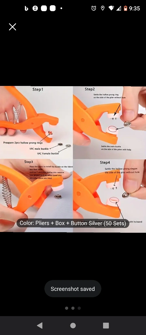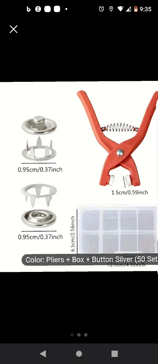 Orange plastic pliers for installing 50 sets of silver snap fasteners. Includes a clear plastic storage box. Measurements included in images. Great for clothing and crafts.