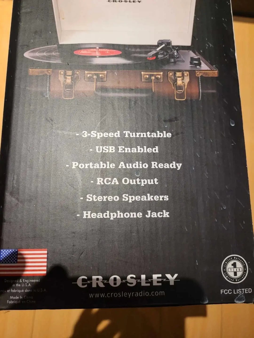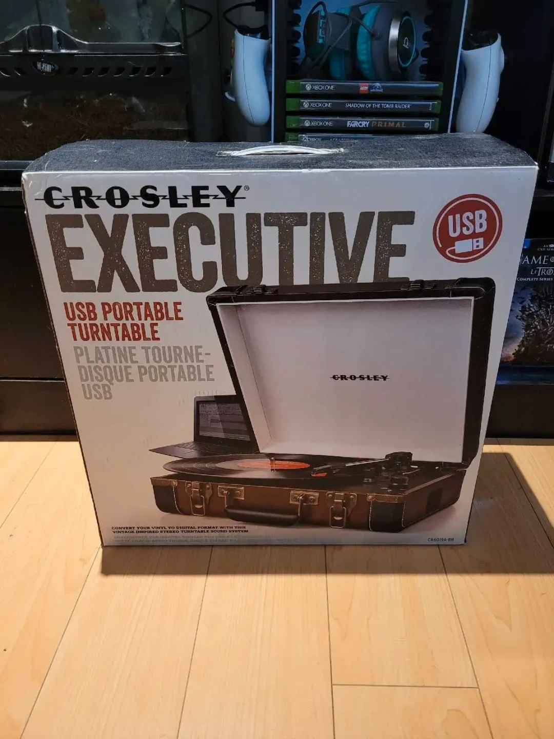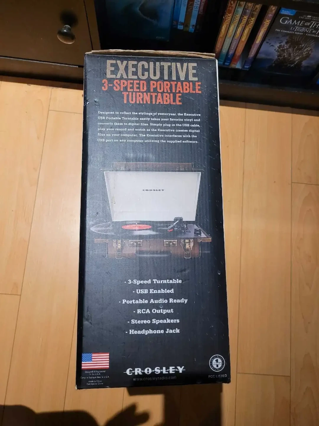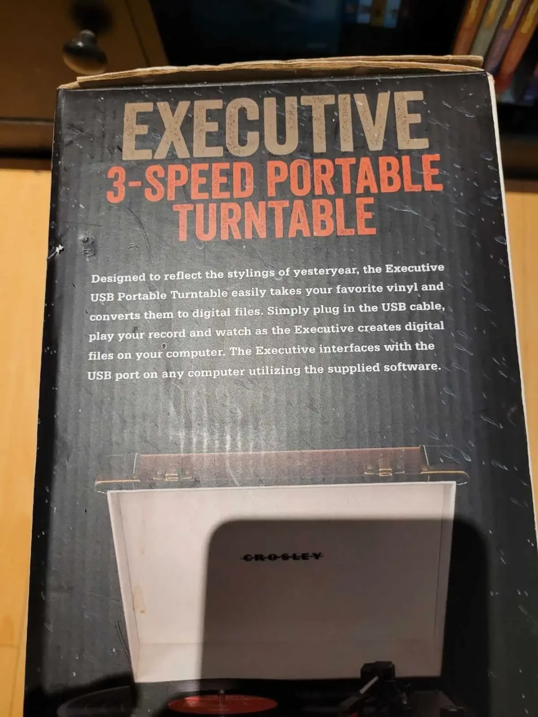 This Crosley Executive turntable is 3-speed and USB enabled. It's portable audio ready and includes stereo speakers. It also has an RCA output and a headphone jack.