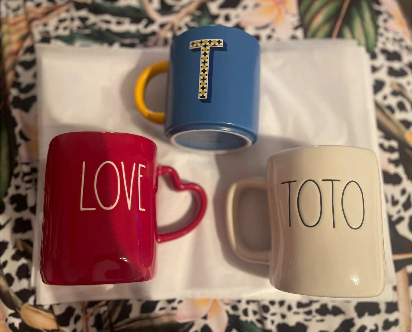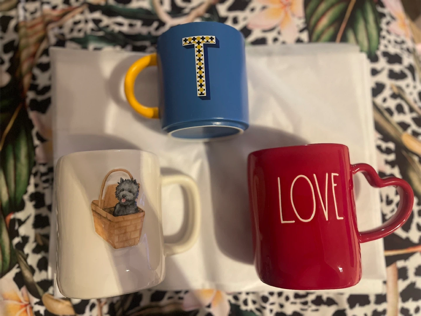 Barely used, in great condition (no chips or cracks). 2 large Rae Dunn and 1 standard Indigo T initial ceramic mugs. Dishwasher-safe. $7 each or $15 for all