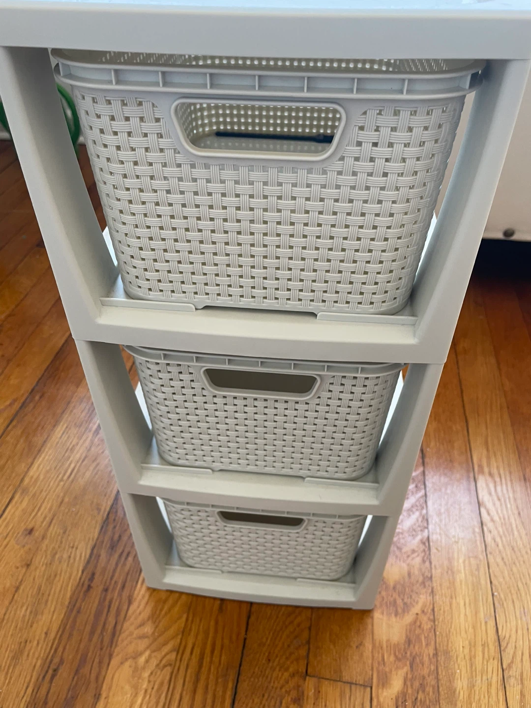 Handy 3-tier storage drawer with plastic weave baskets! It's perfect for organizing items in any room of your home. The neutral color blends in with most decor styles. It's in great condition and ready to use
