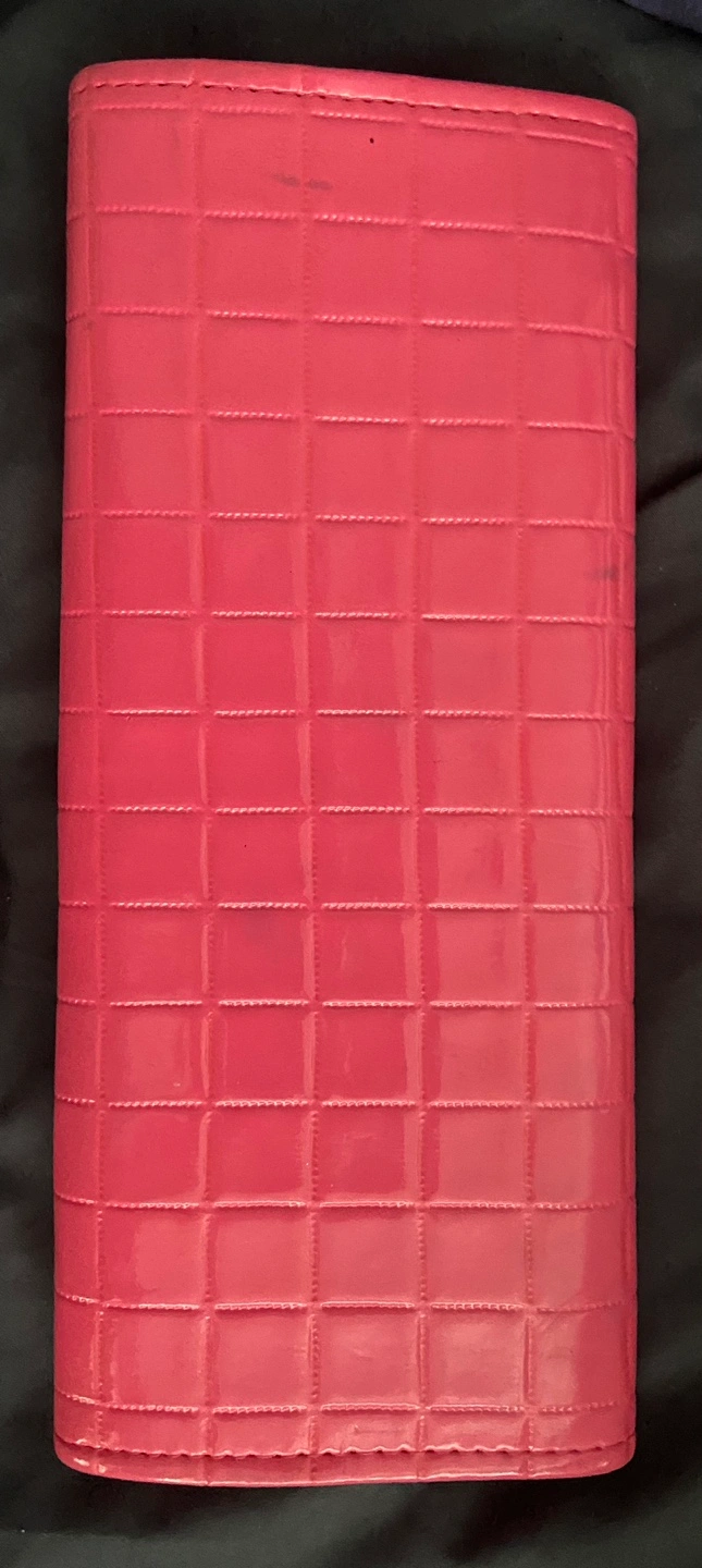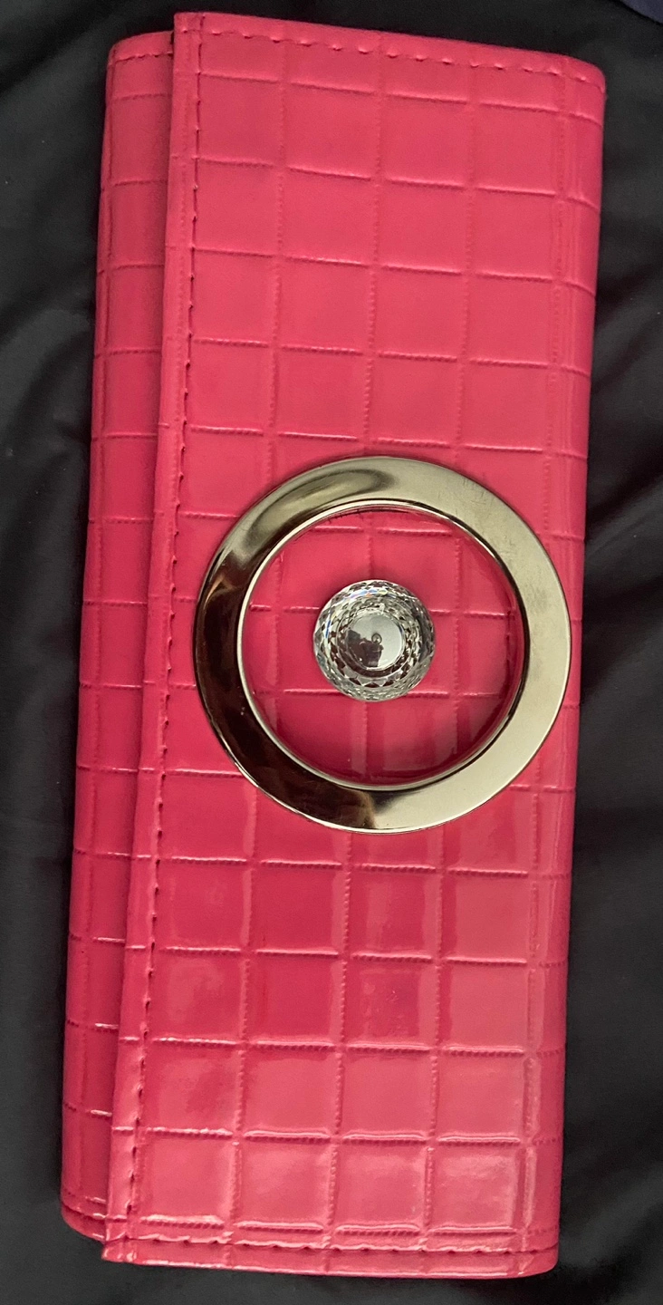 Stylish pink patent leather clutch. Features a unique circular silver-toned clasp with a decorative centrepiece. Quilted design. Perfect for evenings out.