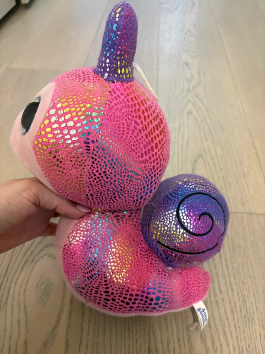 This is a cute pink plush toy shaped like a snail. It features sparkly fabric details on its shell and body, with big green glittery eyes. Perfect for playtime or as a colourful decoration! Small stain near eyes as shown in photo #3.