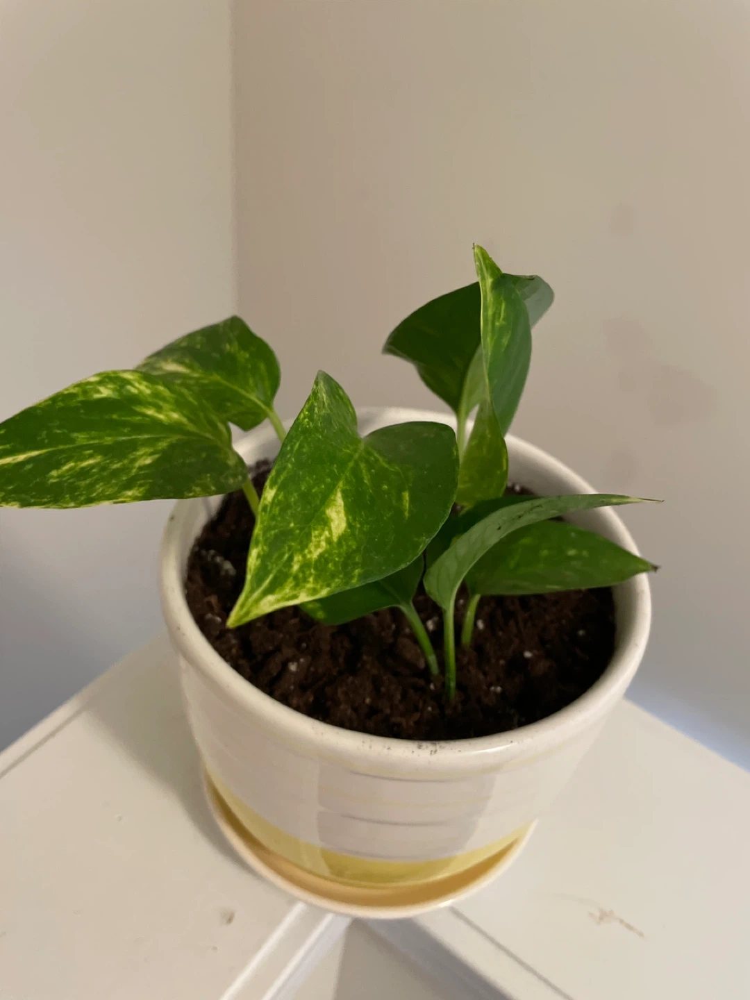 A healthy Pothos plant in a ceramic yellow and white pot with a saucer. It's a lovely addition to any indoor space. This plant is known for its easy-care nature and air-purifying qualities.