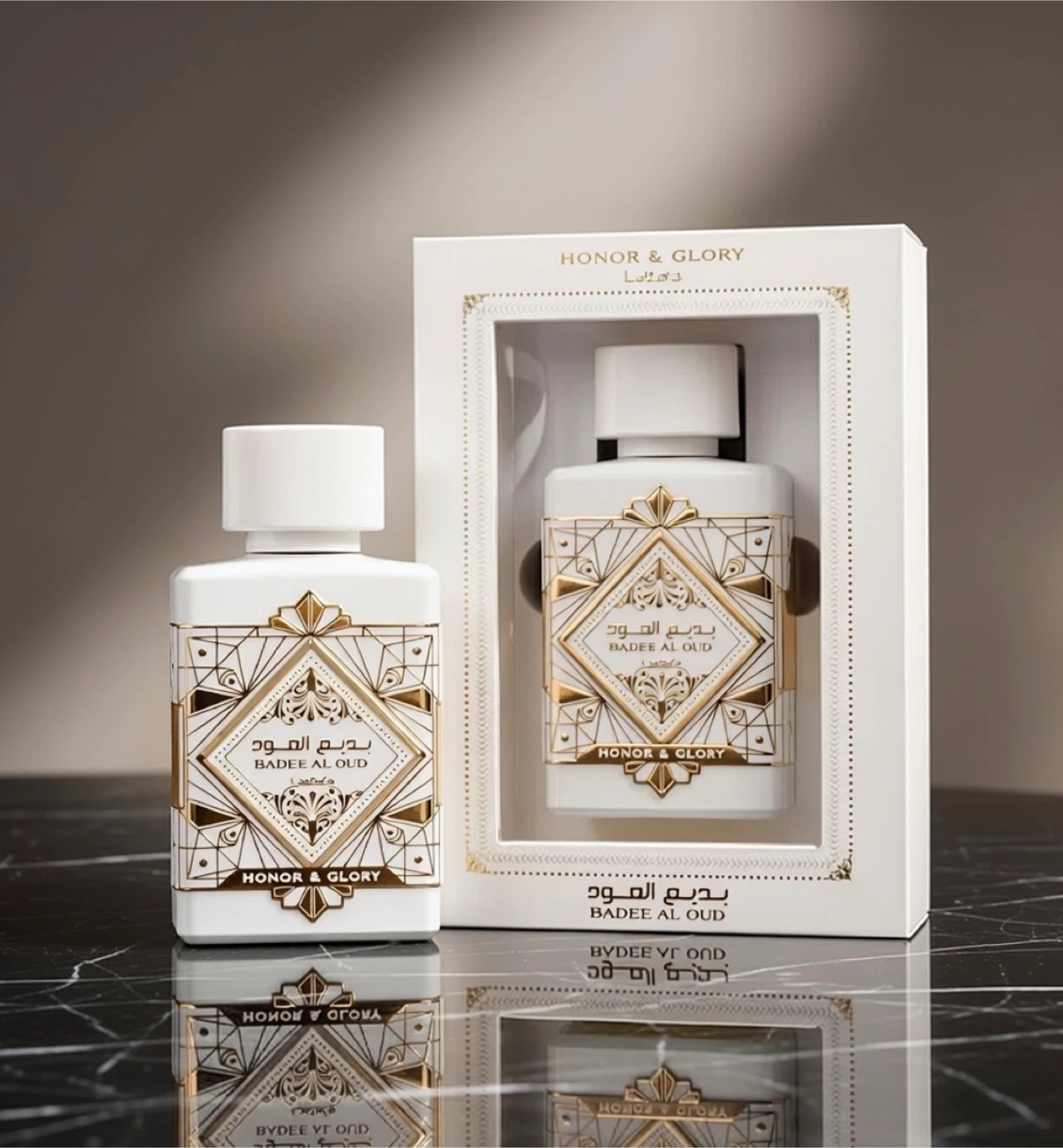 This is the Lattafa Bade Al Oud Honor & Glory Eau de Parfum. It's a fragrance with a white and gold bottle design. Includes the original box packaging.