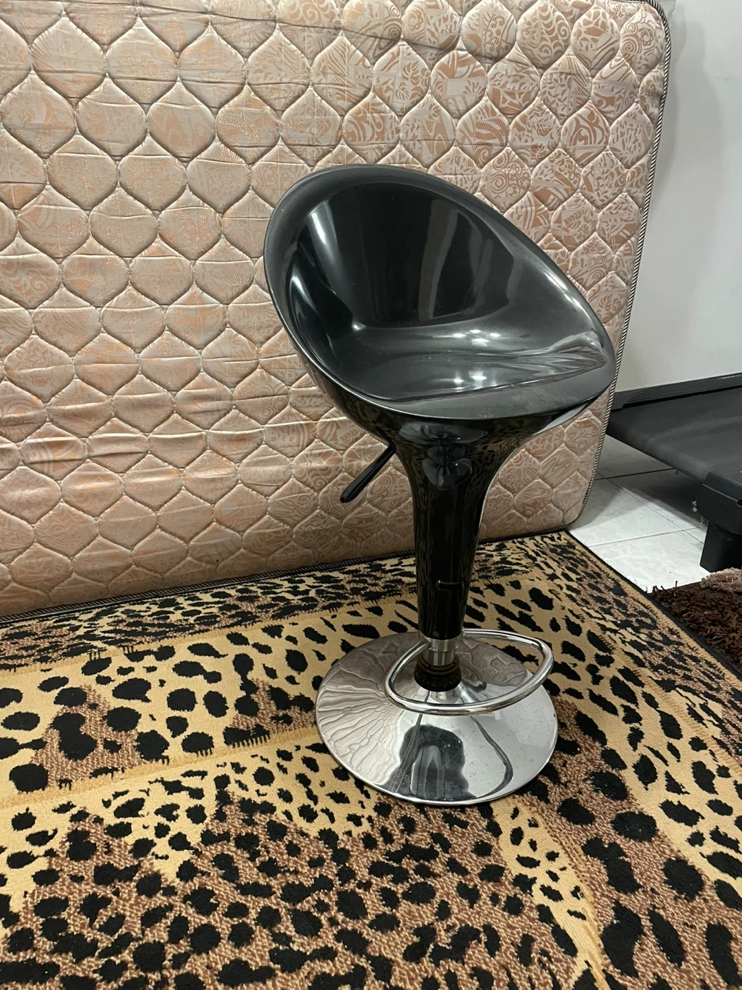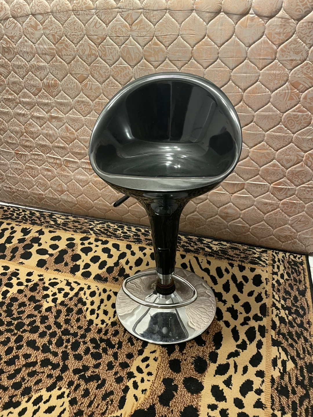 This is a stylish black bar stool with a modern design. It features a sleek, moulded seat and a chrome adjustable base. The stool is adjustable in height, making it versatile for different counter or bar heights. It's built for comfort and durability!