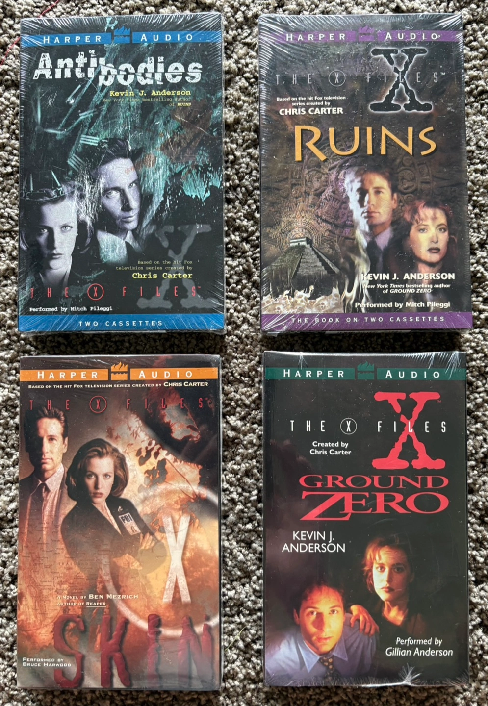 Dive into the intriguing world of "The X-Files" with this set of four vintage audio book cassettes. Featuring the works of Kevin J. Anderson and Ben Mezrich, these tapes bring to life the science fiction narratives that have captivated audiences for decades. The collection includes the stories 'Ground Zero', 'Ruins', 'Antibodies', and 'Skin'’, offering a runtime of 3 hours per story.
